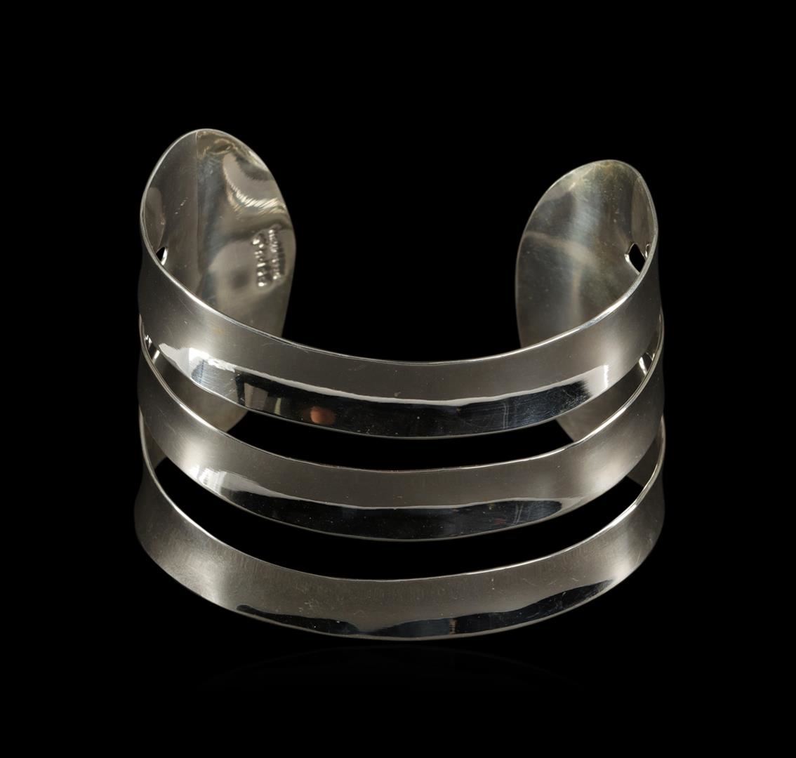 One of a kind high fashion sterling silver cuff bracelet weighing 36.5 grams. This sterling silver promises a lasting shine.