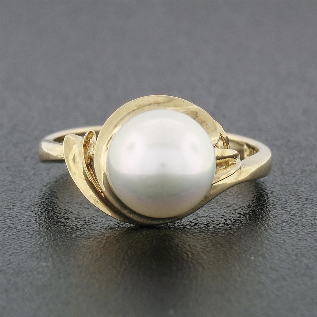 A vintage solid 18k yellow gold solitaire ring, featuring 1 round shape cultured pearl (8mm).The ring is size 5.5, weighs a total of 3.11 grams, and measures 9.7mm wide.