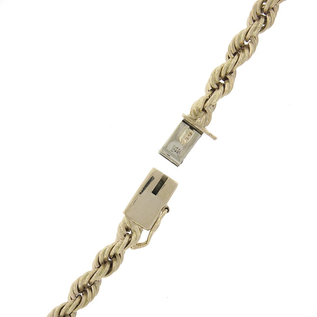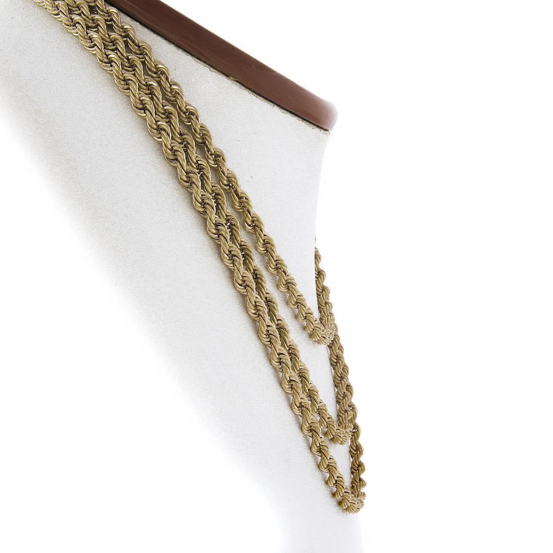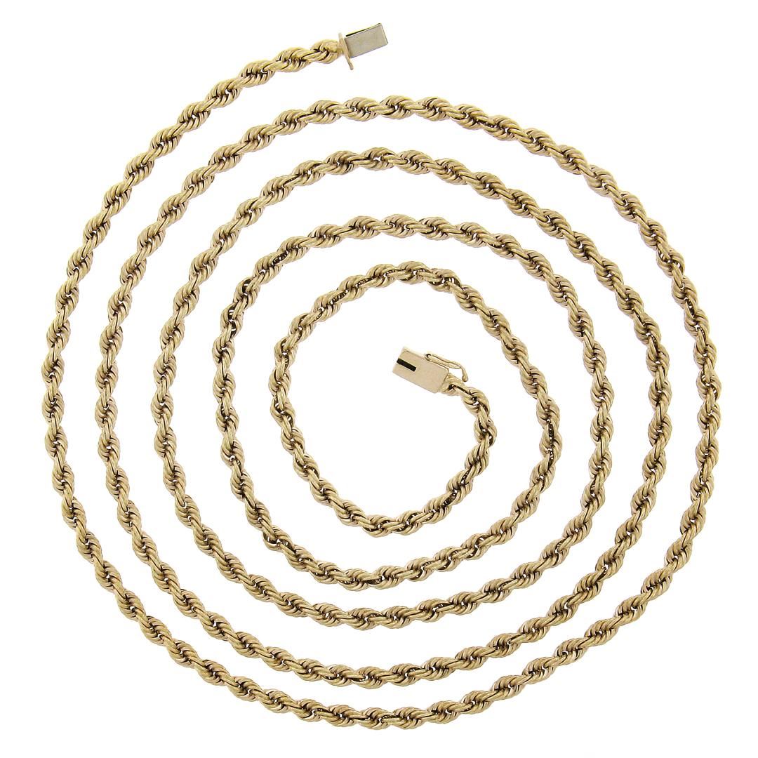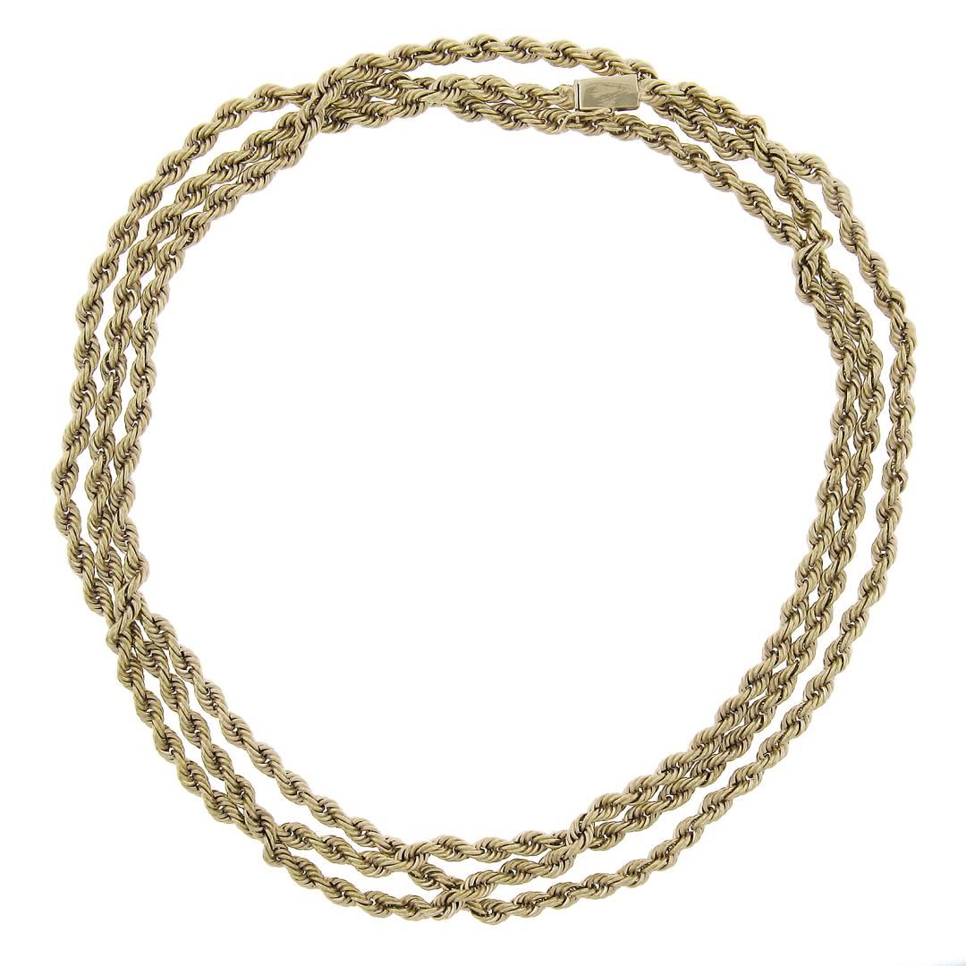 A solid 14k yellow gold long rope link chain necklace. It weighs a total of 65.35 grams, measures 4mm wide, and measures 46 inches in length.
