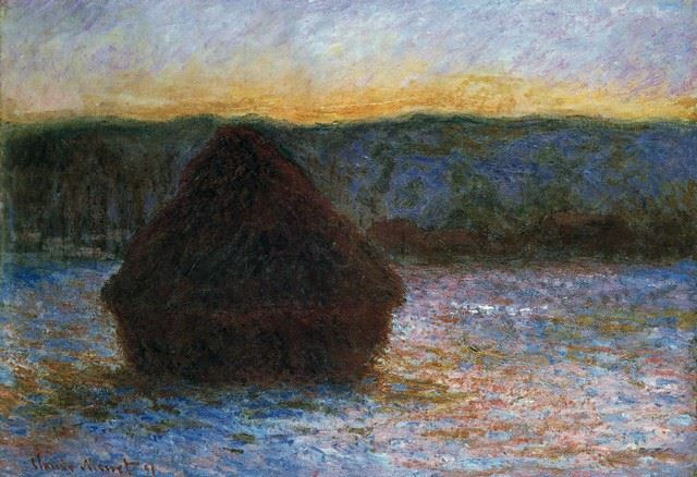 Artist: Claude Monet - Title: Haylofts Thaw, Sunset - Medium: Fine Art Reproduction Giclee on Canvas - Image Size: Approximately 13.75 inches x 20 inches - Unframed on Unstretched Canvas - Biography: Claude Monet was born on November 14, 1840, in Paris, France. He enrolled in the Academy Suisse. After an art exhibition in 1874, a critic insultingly dubbed Monet's painting style "Impression," since it was more concerned with form and light than realism, and the term stuck. Monet struggled with depression, poverty and illness throughout his life. He died in 1926.