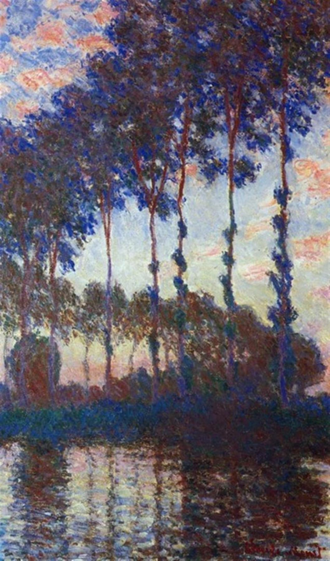 Artist: Claude Monet - Title: Poplars, Sunset - Medium: Fine Art Reproduction Giclee on Canvas - Image Size: Approximately 32 inches x 18.75 inches - Unframed on Unstretched Canvas - Biography: Claude Monet was born on November 14, 1840, in Paris, France. He enrolled in the Academy Suisse. After an art exhibition in 1874, a critic insultingly dubbed Monet's painting style "Impression," since it was more concerned with form and light than realism, and the term stuck. Monet struggled with depression, poverty and illness throughout his life. He died in 1926.