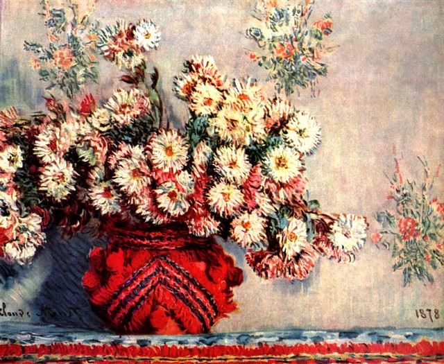 Artist: Claude Monet - Title: Still Life with Chrysanthemums - Medium: Fine Art Reproduction Giclee on Canvas - Image Size: Approximately 16.5 inches x 20 inches - Unframed on Unstretched Canvas - Biography: Claude Monet was born on November 14, 1840, in Paris, France. He enrolled in the Academy Suisse. After an art exhibition in 1874, a critic insultingly dubbed Monet's painting style "Impression," since it was more concerned with form and light than realism, and the term stuck. Monet struggled with depression, poverty and illness throughout his life. He died in 1926.