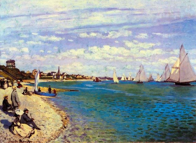 Artist: Claude Monet - Title: The Beach at Sainte Adresse - Medium: Fine Art Reproduction Giclee on Canvas - Image Size: Approximately 23.25 inches x 32 inches - Unframed on Unstretched Canvas - Biography: Claude Monet was born on November 14, 1840, in Paris, France. He enrolled in the Academy Suisse. After an art exhibition in 1874, a critic insultingly dubbed Monet's painting style "Impression," since it was more concerned with form and light than realism, and the term stuck. Monet struggled with depression, poverty and illness throughout his life. He died in 1926.