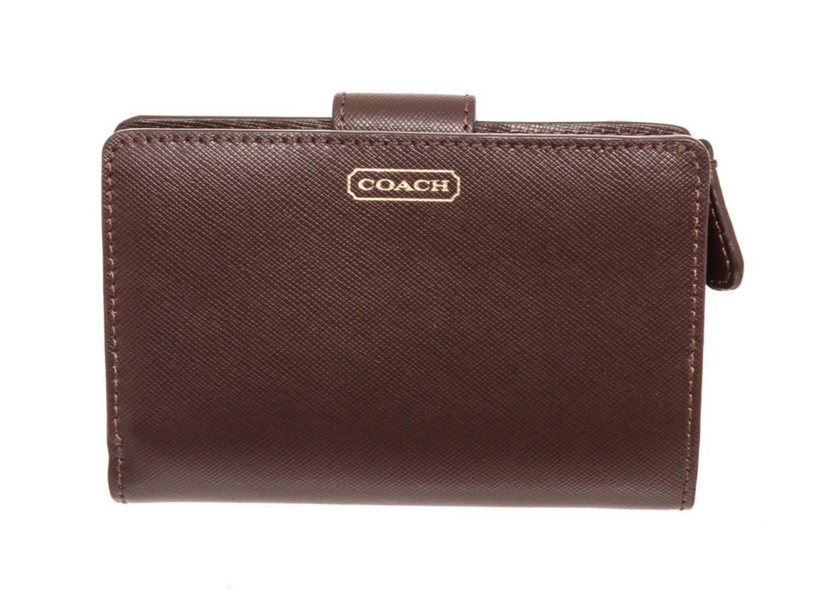 Coach brown Darcy leather tab wallet with gold-tone hardware, embossed logo at front, bill compartment at top, five interior compartments; one with zip closure, seven cardholder slots; one with ID slot and overall snap closure at tab. Measurements: Length: 5.3 in / 13 cm Width: 1 in / 3 cm 3.65 in / 9 cmCONDITION: Pre-Owned Good overall, please see photographs for detail.