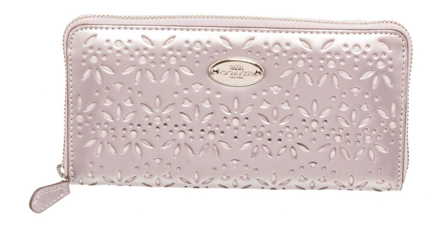 Coach silver leather Eyelet Accordian zippy wallet with silver-tone hardware, logo placard at front, six interior compartments; one with zip closure, twelve cardholder slots and overall zip around closure. Measurements: Length: 8.15 in / 21 cm Width: 0.85 in / 2 cm 4.3 in / 11 cmCONDITION: Pre-Owned Good overall, please see photographs for detail.
