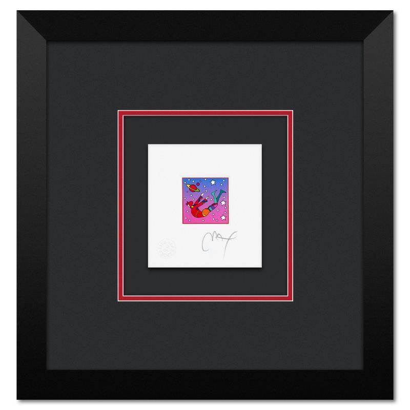 "Cosmic Flyer in Space Ver. II" is a limited edition lithograph on paper by Peter Max, numbered and hand signed by the artist. This piece comes framed. Includes Certificate of Authenticity from Peter Max Studios. Measures approx. 14" x 13.5" (frame), 5" x 4.5" (image).