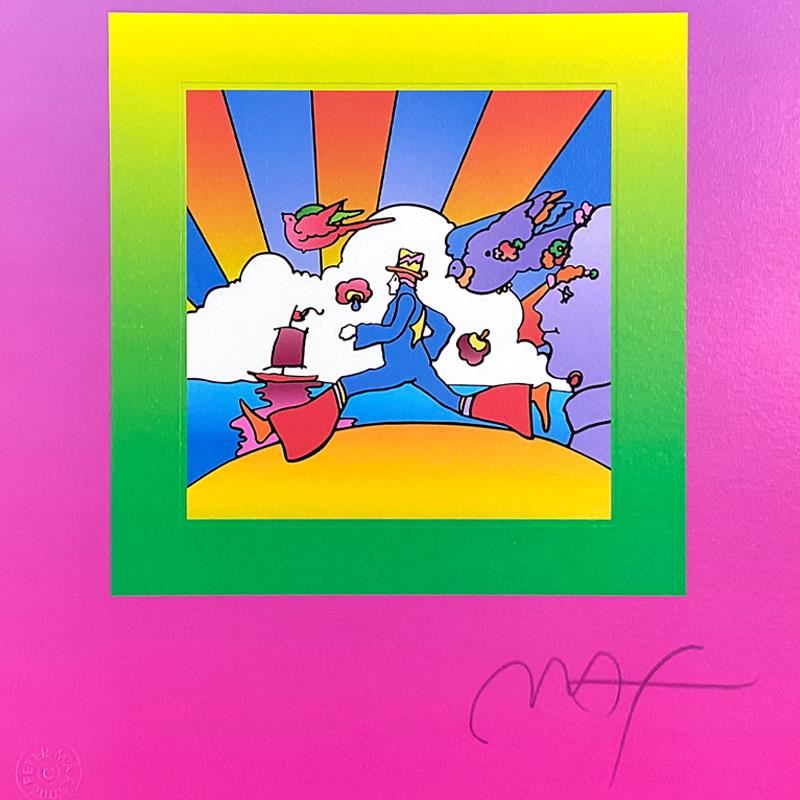 "Cosmic Runner on Blends" is a limited edition lithograph on paper by Peter Max, numbered and hand signed by the artist. This piece comes framed. Includes Certificate of Authenticity from Peter Max Studios. Measures approx. 23" x 20" (frame), 13" x 10" (image).