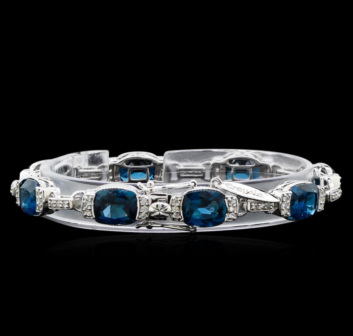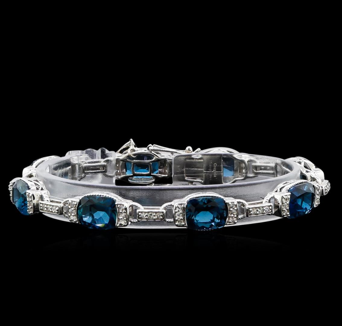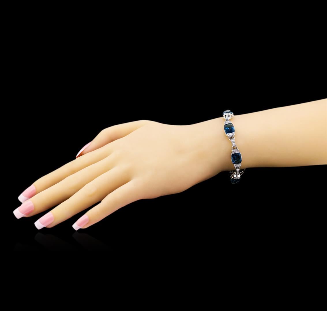From the brand whose products have inspired creative expression for more than 110 years comes this beautiful bracelet by Crayola. This stunning piece of jewelry reflects the image and colorful personality of the Crayola brand. The Bracelet features .925 Silver With Rhodium weighing 17.73oz containing Midnight Blue London Blue Topaz (AAA) Cushion 10x8mm - 8Pcs + Natural White Sapphire Round 1.50mm - 69Pcs (With J BACK). Total Blue Topaz weight is 27ct. Total White Sapphire weight is 1.17ct. Measures: 7.50".