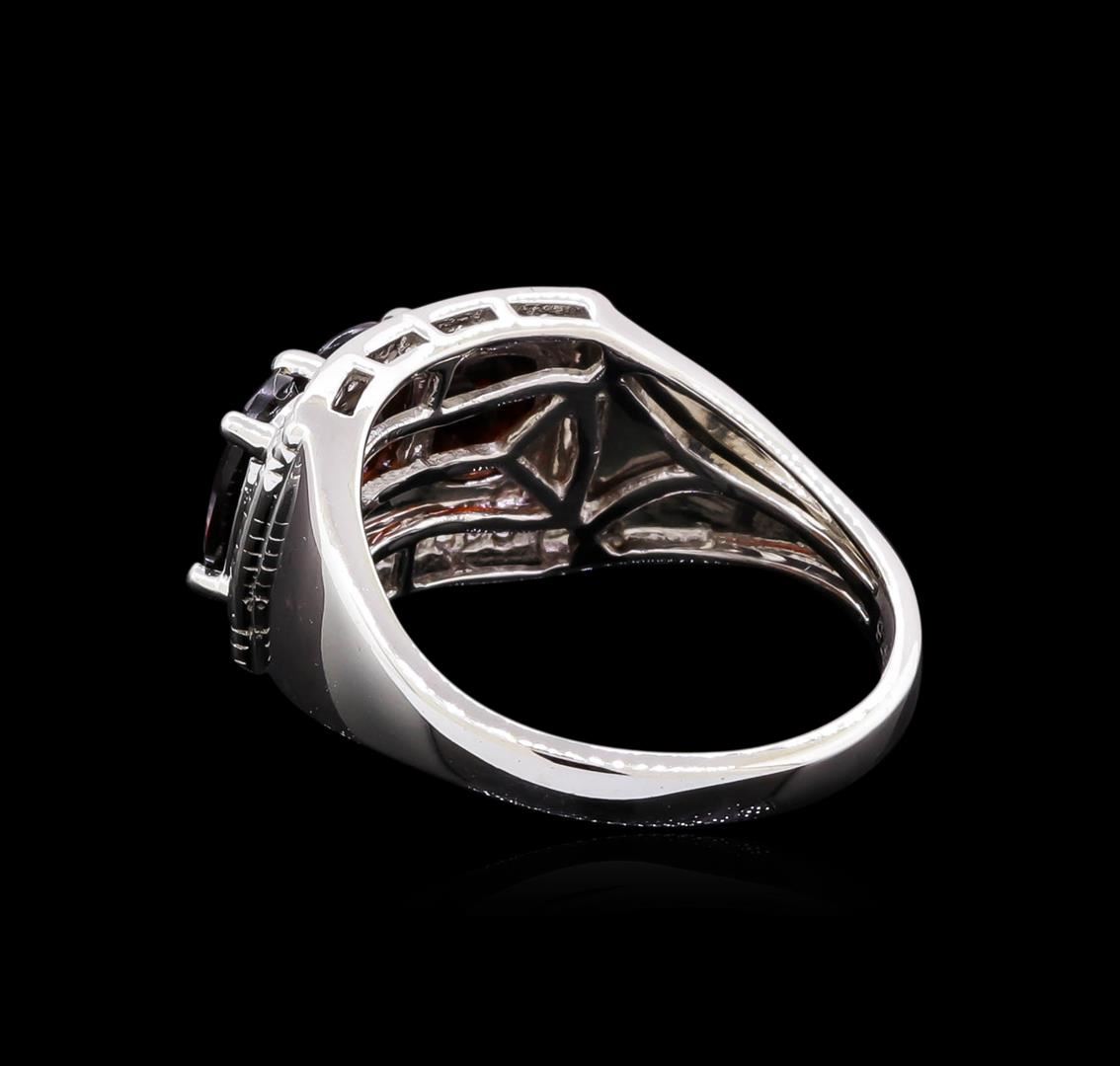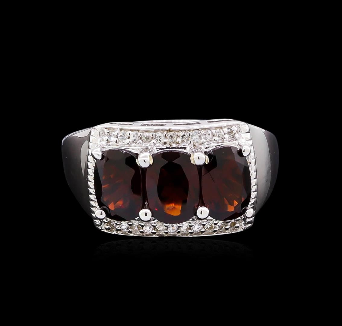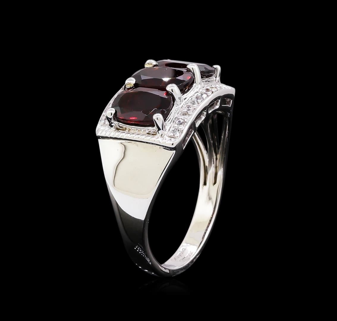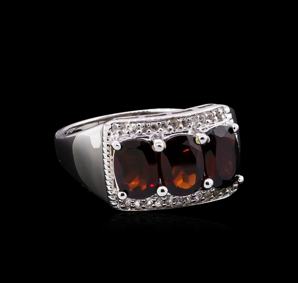 From the brand whose products have inspired creative expression for more than 110 years comes this beautiful ring by Crayola. This stunning piece of jewelry reflects the image and colorful personality of the Crayola brand. The Ring features .925 Silver With Rhodium weighing 4.77oz containing Maroon Garnet (AAA) Cushion 7x5mm - 3Pcs + White Sapphire Dia Cut Round 1.00mm - 22Pcs (With J BACK). Total Garnet weight is 3ct. Total White Sapphire weight is 0.11ct.