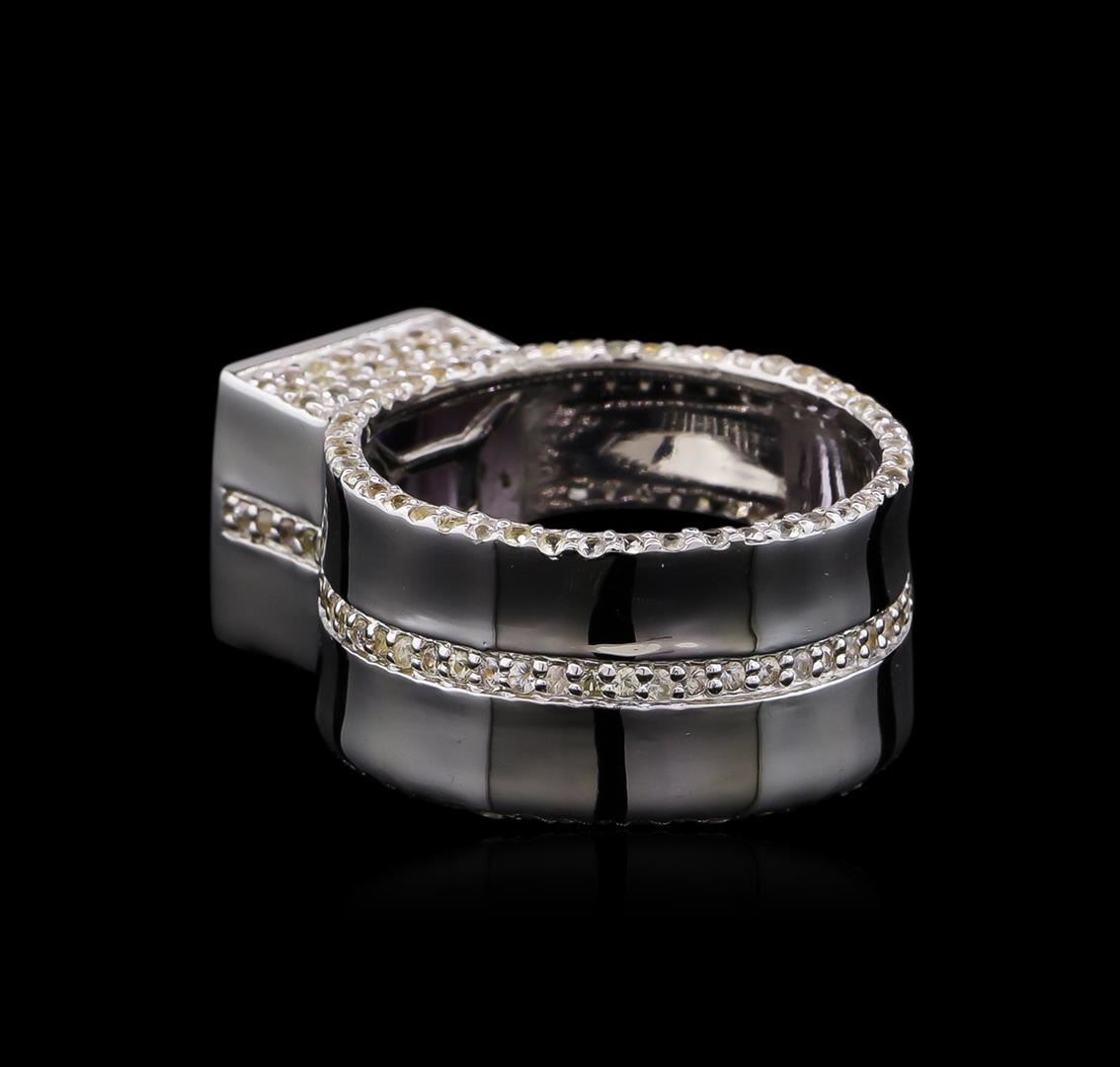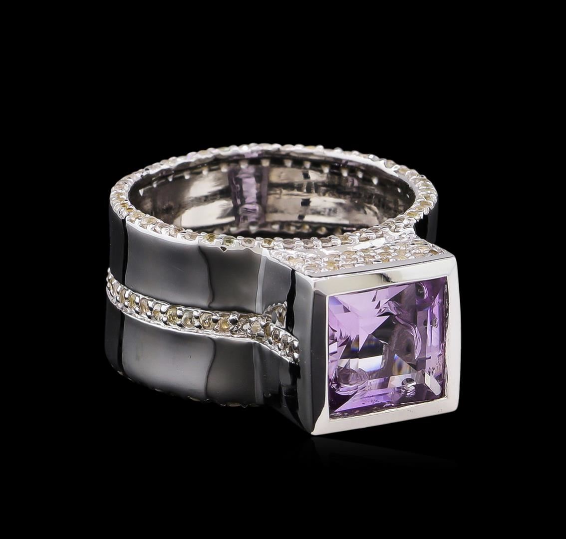From the brand whose products have inspired creative expression for more than 110 years comes this beautiful ring by Crayola. This stunning piece of jewelry reflects the image and colorful personality of the Crayola brand. The Ring features .925 Silver With Rhodium weighing 8.2oz containing Blush Dark Pink Amethyst (AAA) Square 9.00mm - 1Pc + Natural White Sapphire Round 1.10mm - 195Pcs (With J BACK). Total Pink Amethyst weight is 3.5ct. Total White Sapphire weight is 1.76ct.
