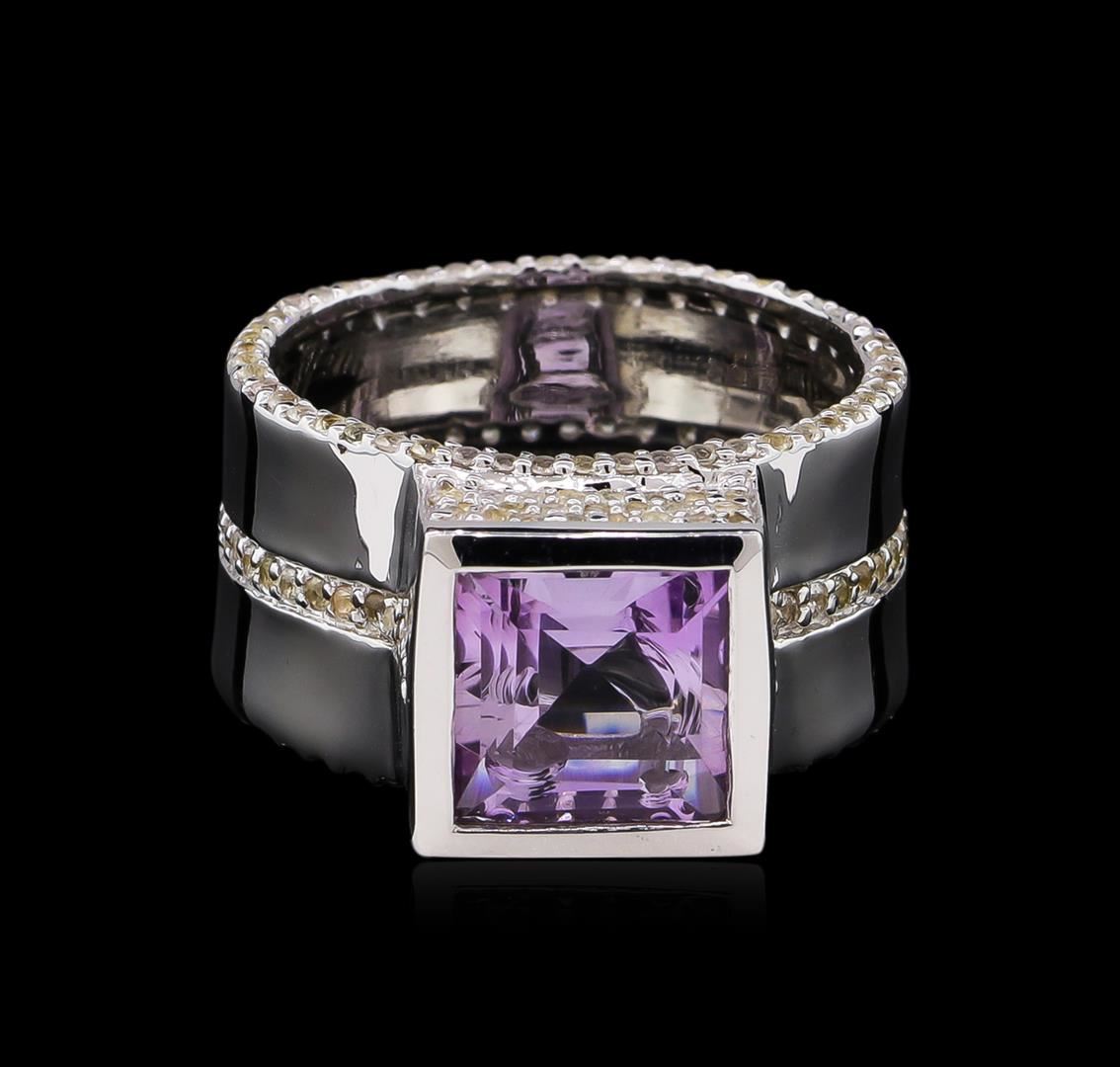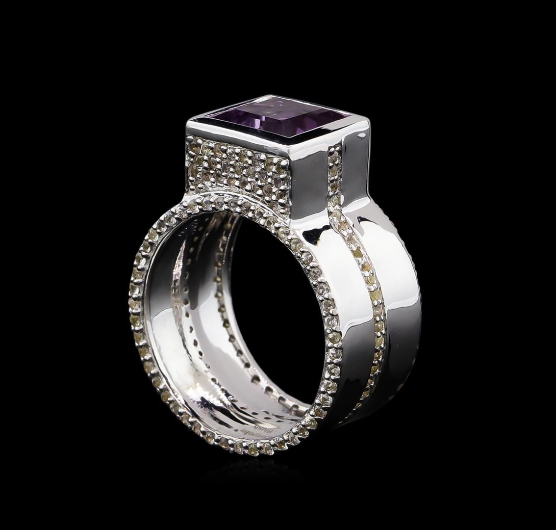 From the brand whose products have inspired creative expression for more than 110 years comes this beautiful ring by Crayola. This stunning piece of jewelry reflects the image and colorful personality of the Crayola brand. The Ring features .925 Silver With Rhodium weighing 8.2oz containing Blush Dark Pink Amethyst (AAA) Square 9.00mm - 1Pc + Natural White Sapphire Round 1.10mm - 195Pcs (With J BACK). Total Pink Amethyst weight is 3.5ct. Total White Sapphire weight is 1.76ct.
