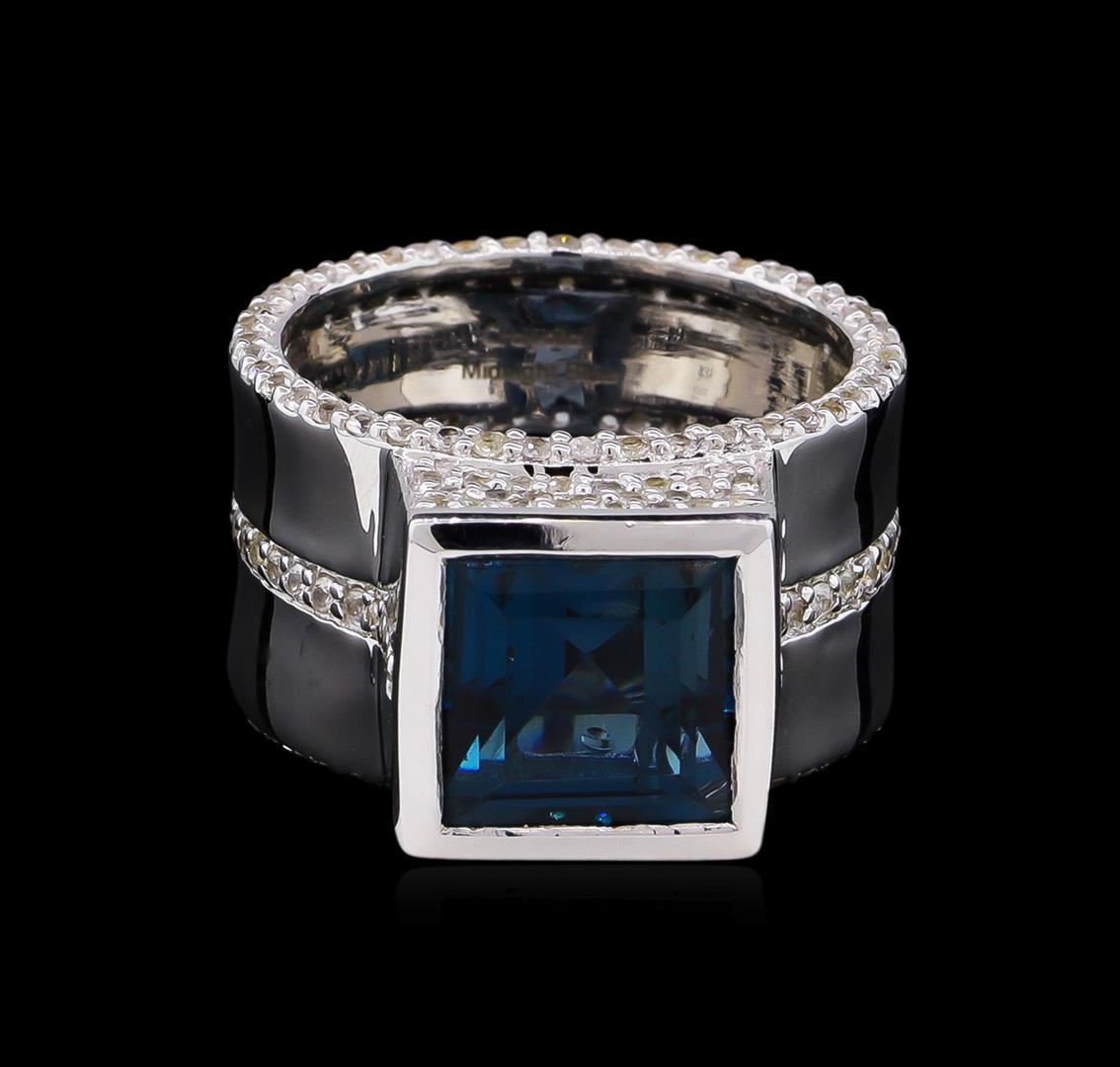 From the brand whose products have inspired creative expression for more than 110 years comes this beautiful ring by Crayola. This stunning piece of jewelry reflects the image and colorful personality of the Crayola brand. The Ring features .925 Silver With Rhodium weighing 8.2oz containing Midnight Blue London Blue Topaz (AAA) Square 9.00mm - 1Pc + Natural White Sapphire Round 1.10mm - 195Pcs (With J BACK). Total Blue Topaz weight is 4.2ct. Total White Sapphire weight is 1.76ct.
