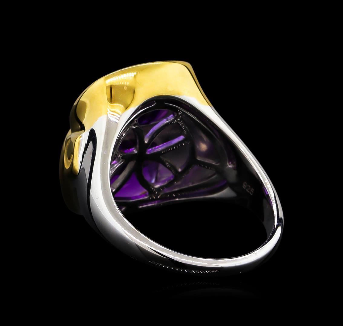 From the brand whose products have inspired creative expression for more than 110 years comes this beautiful ring by Crayola. This stunning piece of jewelry reflects the image and colorful personality of the Crayola brand. The Ring features .925 Silver With Rhodium Two-Tone weighing 6.5oz containing Purple Heart Amethyst (AAA) Cushion 12x10mm (With J BACK & Yellow Pan Rhodium) Laser engraved "C" logo on side. Total Amethyst weight is 8.9ct.