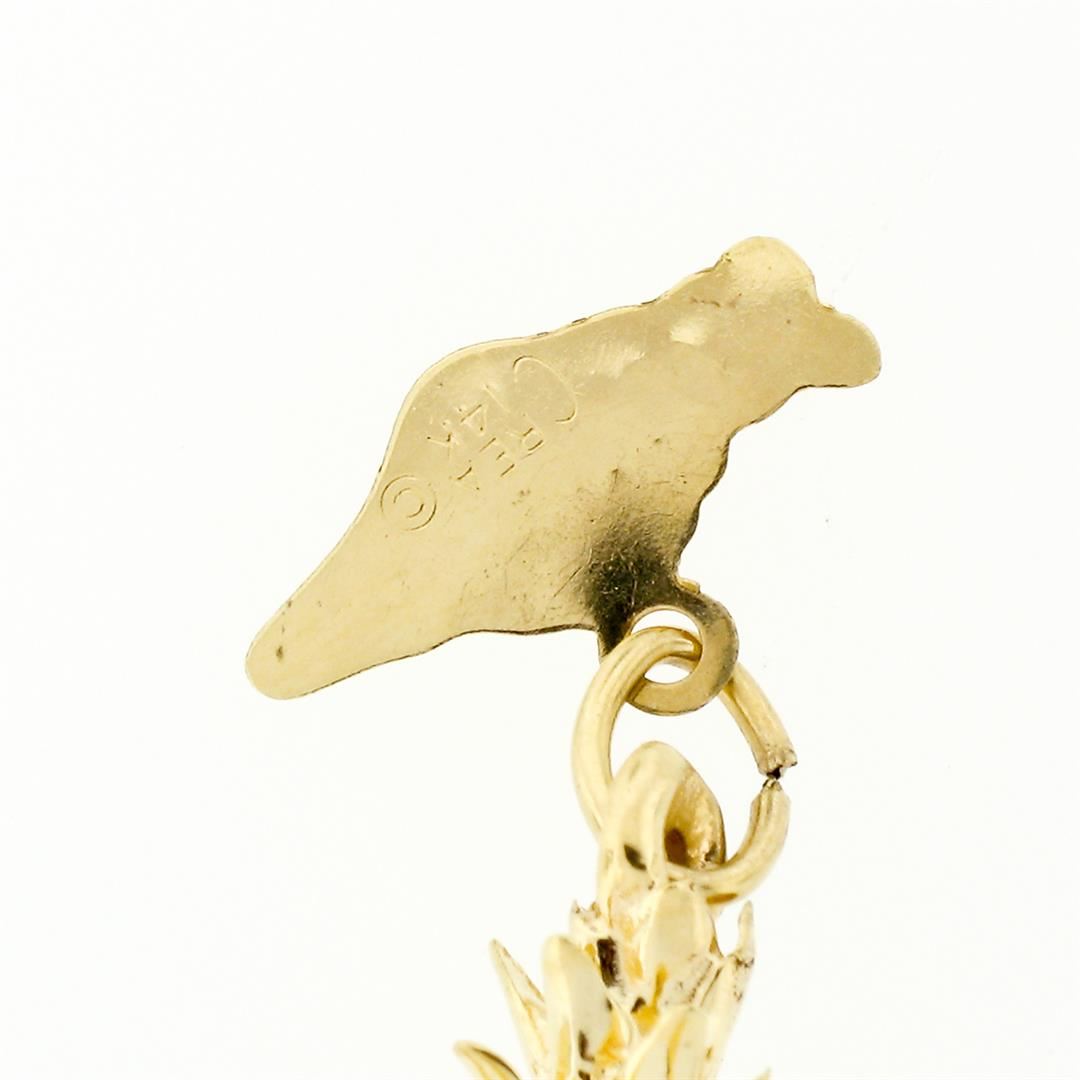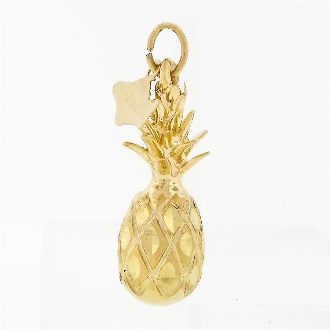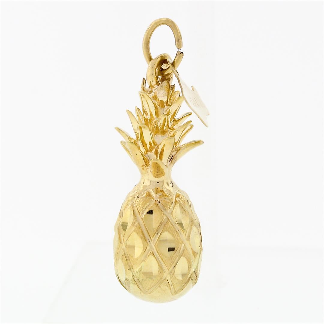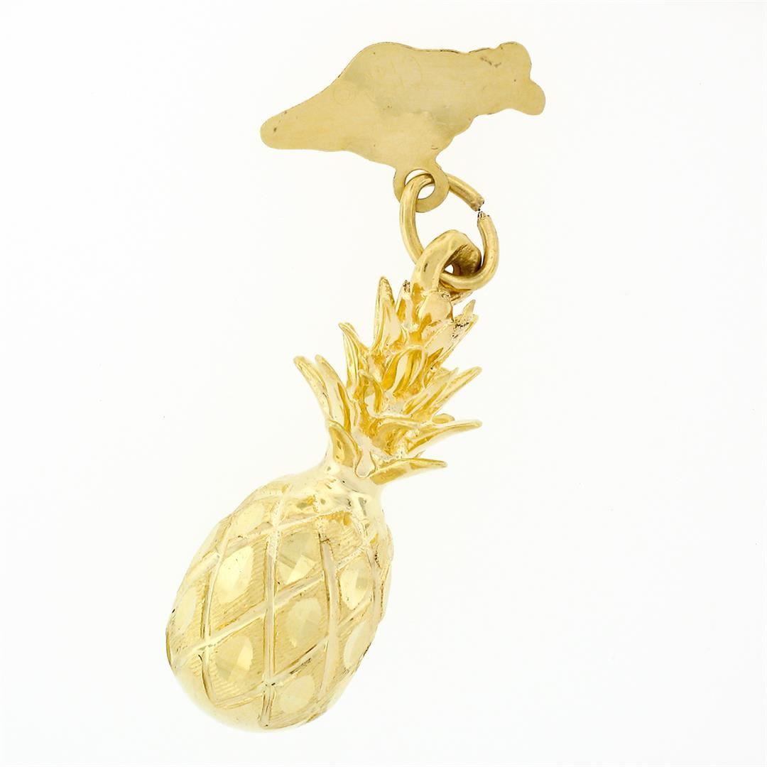 A solid 14k yellow gold 3D pineapple charm pendant by Crea. The pendant weighs a total of 4.26 grams, measures 29.36x8.82mm including the bail, and the inside of the bail measures 2.70x3.10mm.