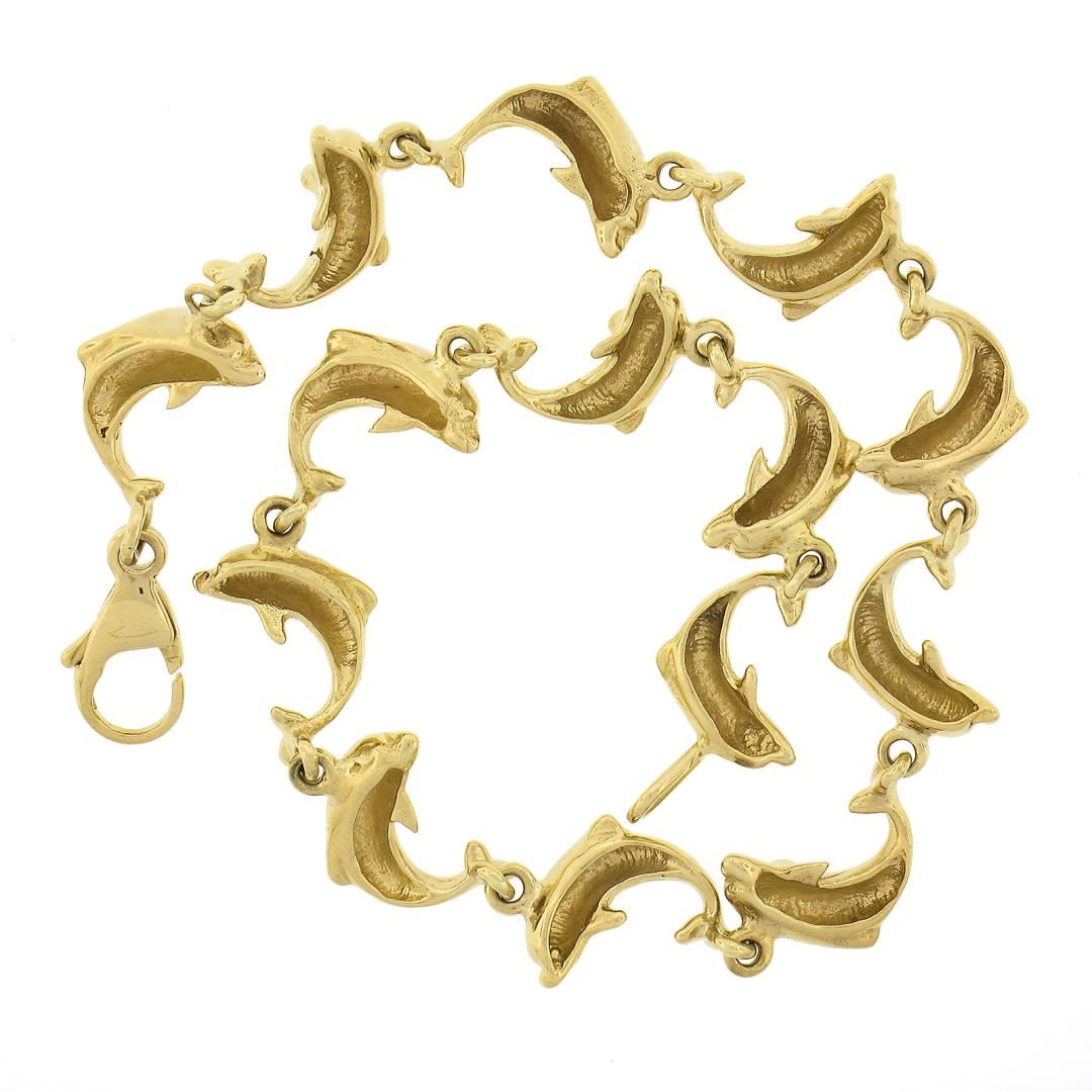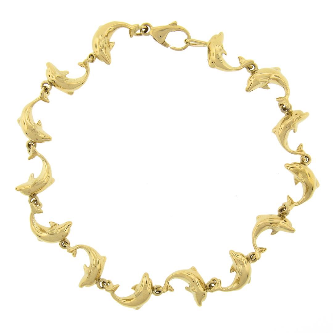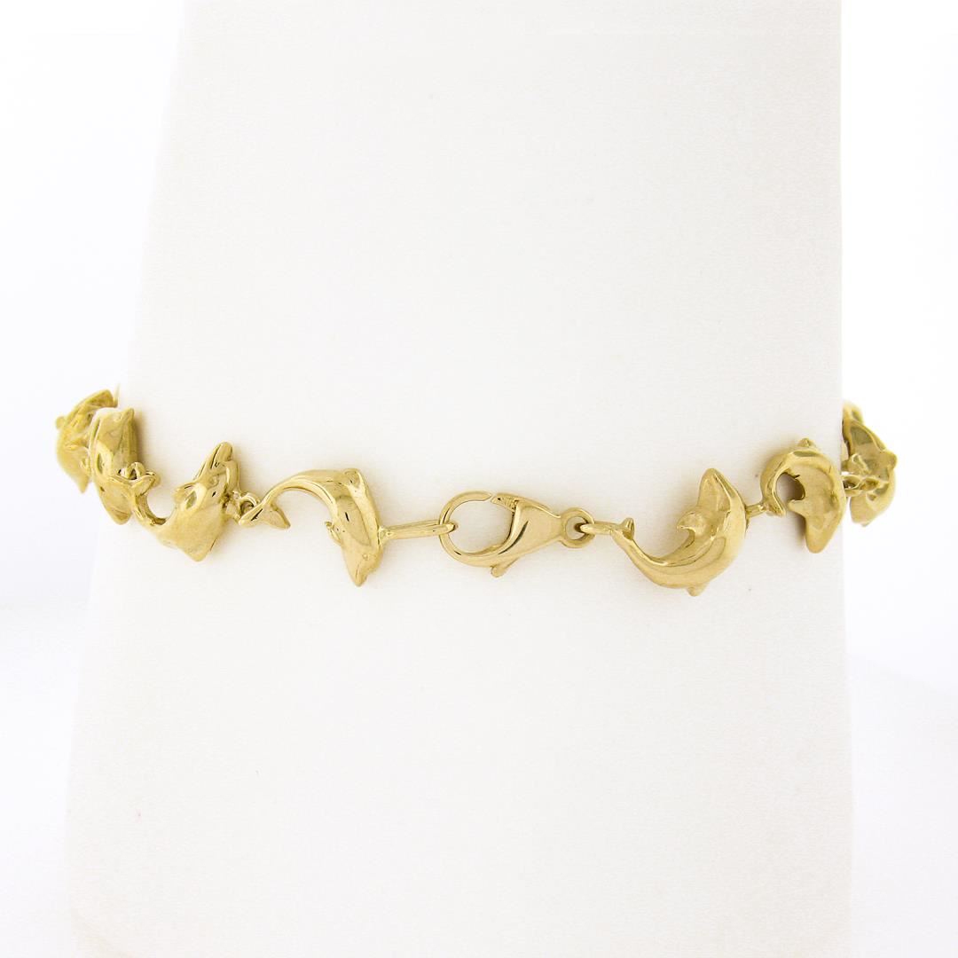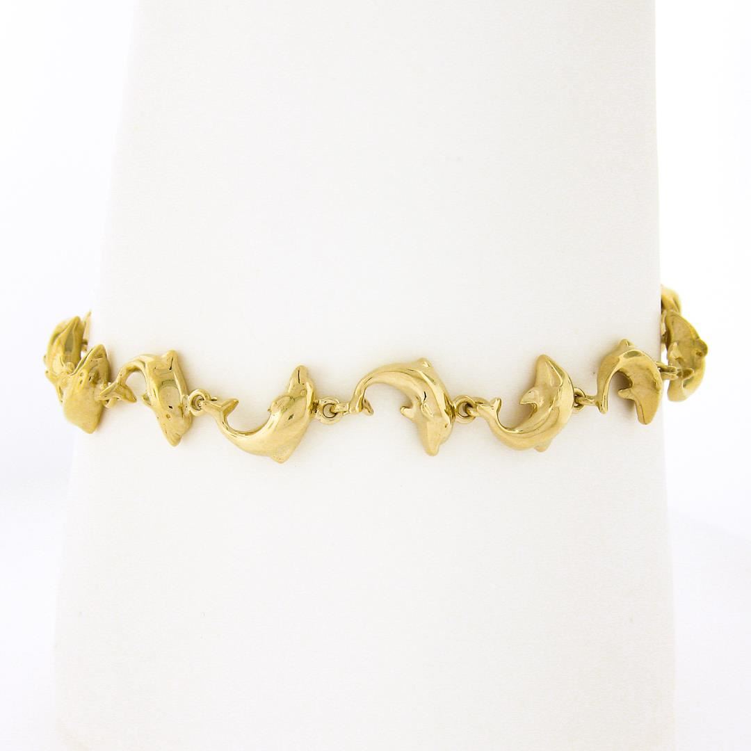 A solid 14k yellow gold dolphins link bracelet. It weighs a total of 11.14 grams, measures 8.7mm wide, and measures 7 inches in length.