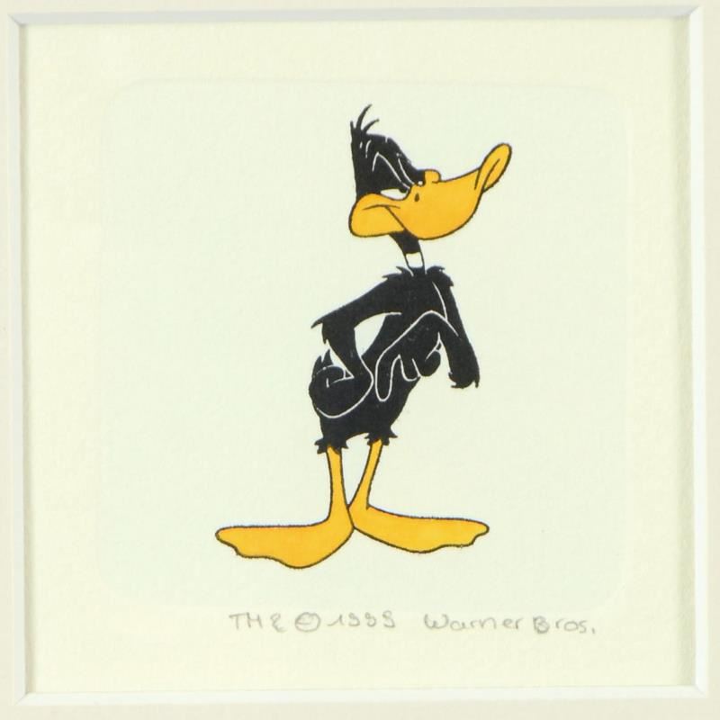"Daffy Duck (Looking to the Side)" is a limited edition etching on paper with hand-tinted coloring from Warner Bros, numbered and dated 1999. This piece comes framed. Measures approx. 9" x 9" (with frame), 1.5" x 2.5" (image).