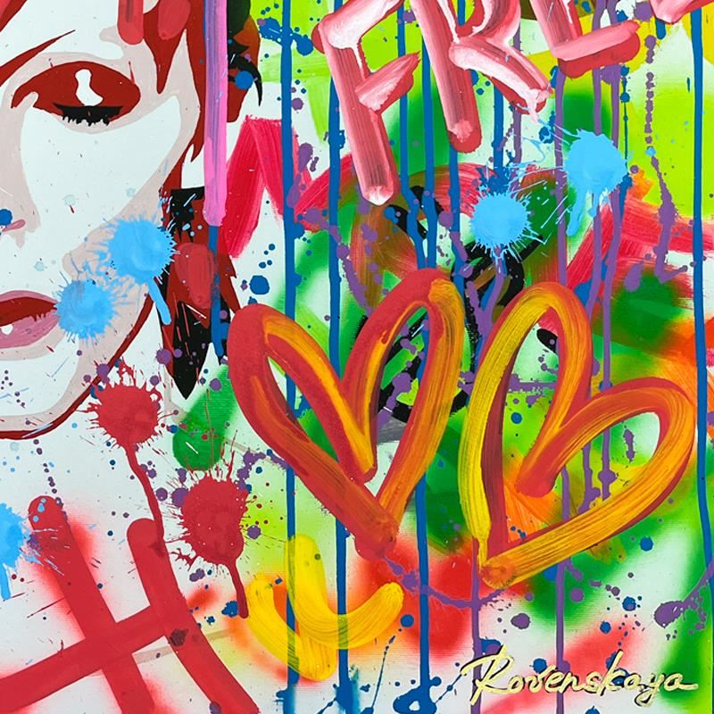 "David Bowie" is a one-of-a-kind mixed media on deckle edge paper by Nastya Rovenskaya; hand signed by the artist. This piece comes custom framed and includes letter of authenticity. Measures approximately 30.5" x 36" (framed), 24.5" x 30" (image).
