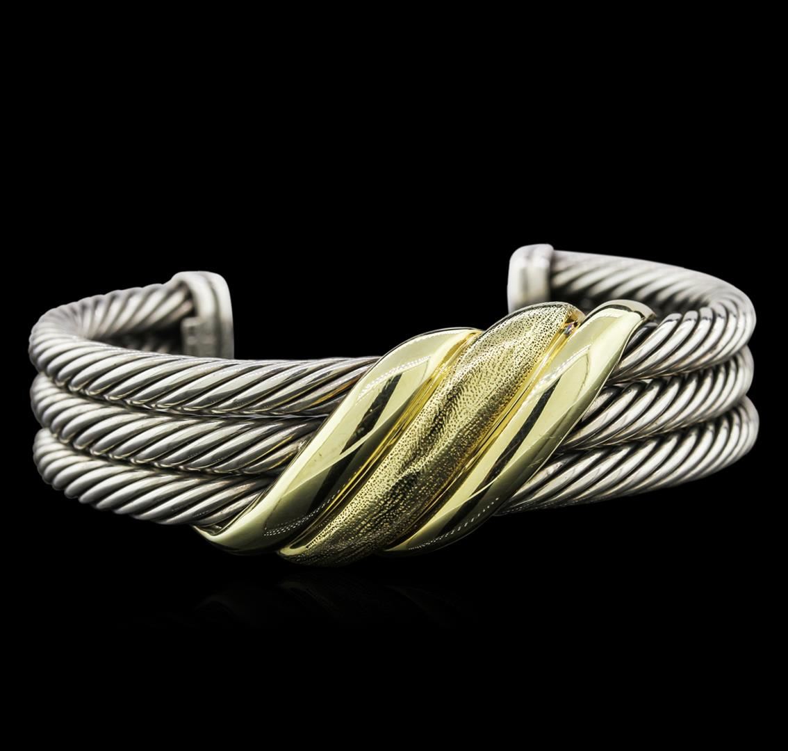 One electronically tested sterling Silver lady's combination cast & assembled fashion cuff bracelet with a bright polish finish. The featured lady's cuff bracelet has three bands of sterling silver with a 14K gold swirl and an internal circumference of 6.5 inches. Trademark is D. YURMAN. Identified with markings of "14K, .925 Sterling". Condition is like new. Total Weight of Cuff Bracelet 50.50gm. GAS Appraised at $1,995.00.