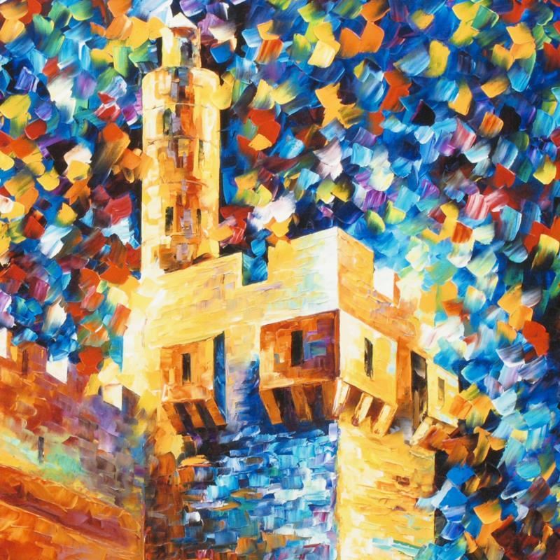 Leonid Afremov's (1955-2019) masterful use of color and texture make his paintings unique collectibles that are sure to brighten any wall. "David's Citadel" is a limited edition giclee on canvas. The piece is numbered and bears the artist's authorized signature. This piece comes gallery wrapped. Includes Letter of Authenticity. Measures approx. 24" x 18" (image).