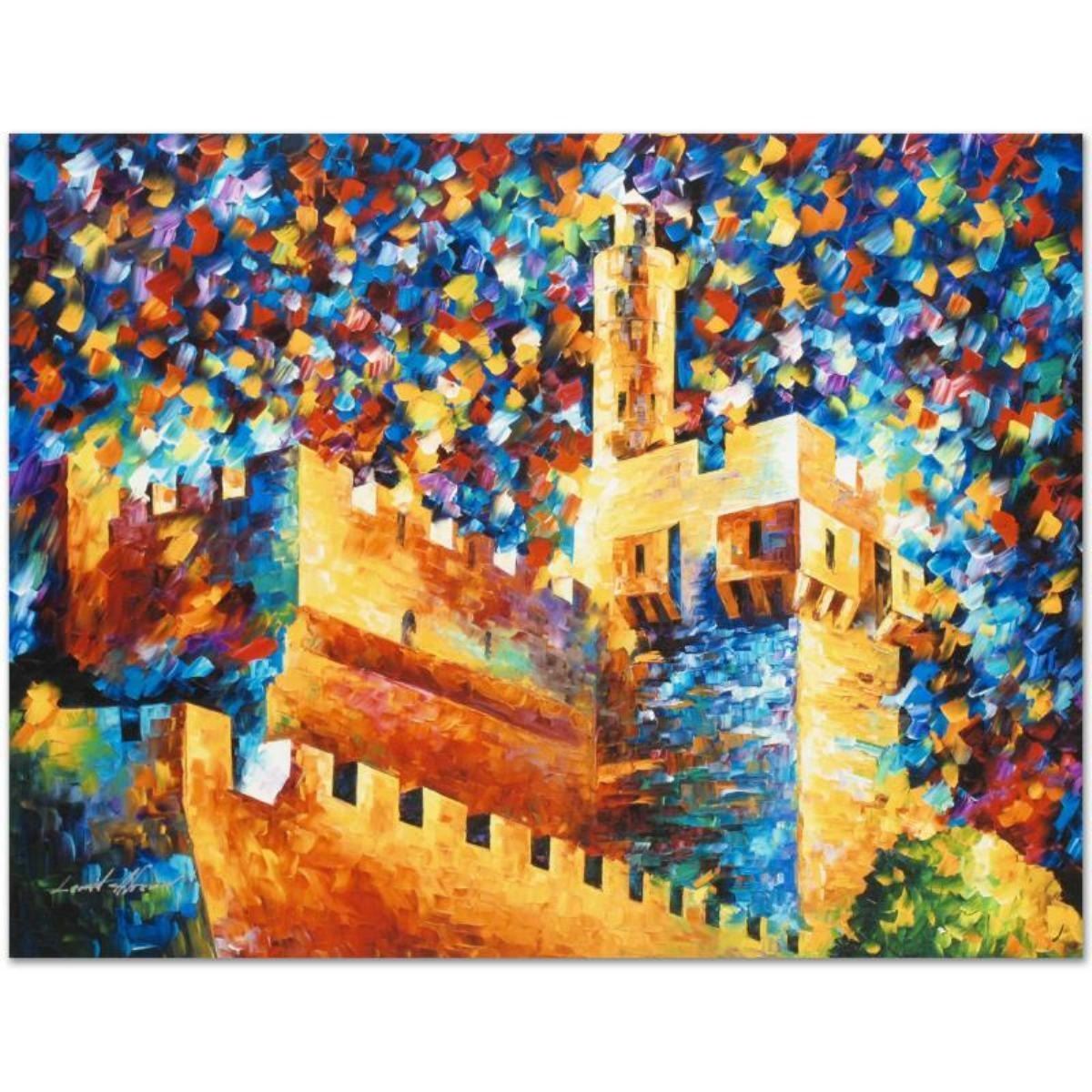 David's Citadel by Afremov (1955-2019). Leonid Afremov's (1955-2019) masterful use of color and texture make his paintings unique collectibles that are sure to brighten any wall. "David's Citadel" is a limited edition giclee on canvas. The piece is numbered and bears the artist's authorized signature. This piece comes gallery wrapped. Includes Letter of Authenticity. Measures approx. 24" x 18" (image). This item requires special handling and may have a longer than usual turnaround.