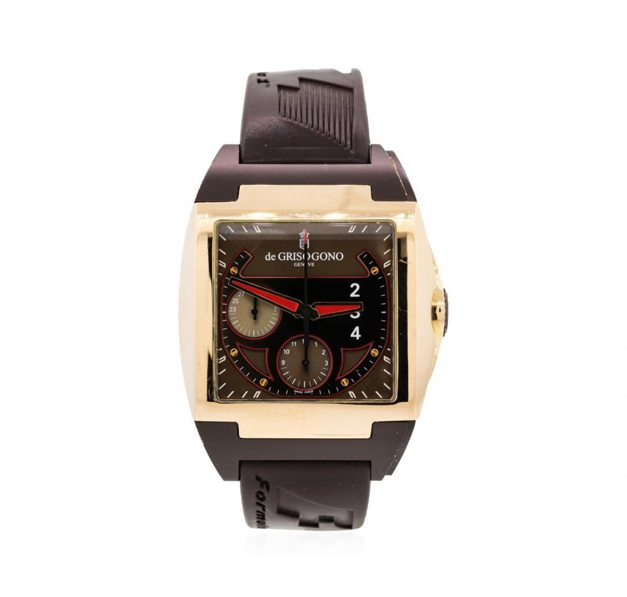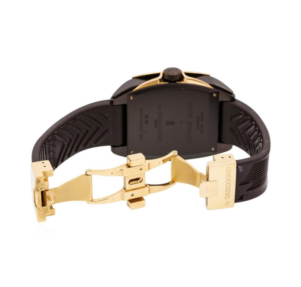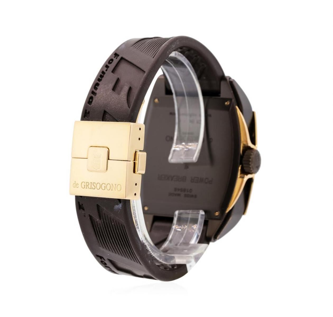 One De Grisogono Instrumento Power Breaker watch with a 35mm x 52.5mm x 12.5mm polished and matt tanned rose gold case, screwed bottom back, satin finished dark brown dial with brown steering wheel enhanced with 6 screws, automatic movement with chronograph function, brown rubber strap with polished 18K rose gold folding buckle. Water resistant to 30 meters. Serial Number 018648.