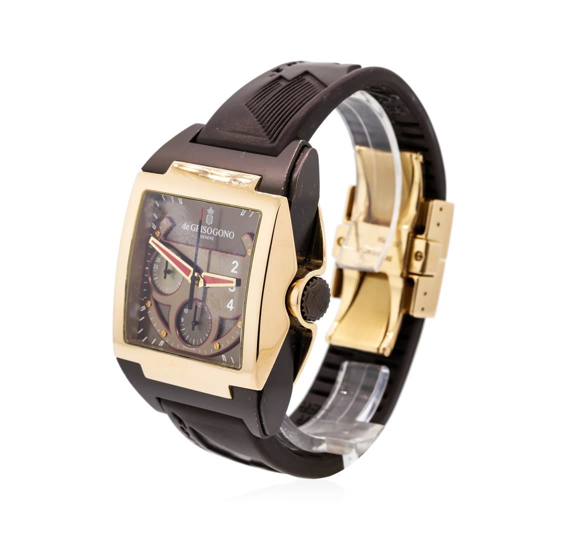 One De Grisogono Instrumento Power Breaker watch with a 35mm x 52.5mm x 12.5mm polished and matt tanned rose gold case, screwed bottom back, satin finished dark brown dial with brown steering wheel enhanced with 6 screws, automatic movement with chronograph function, brown rubber strap with polished 18K rose gold folding buckle. Water resistant to 30 meters. Serial Number 018648.