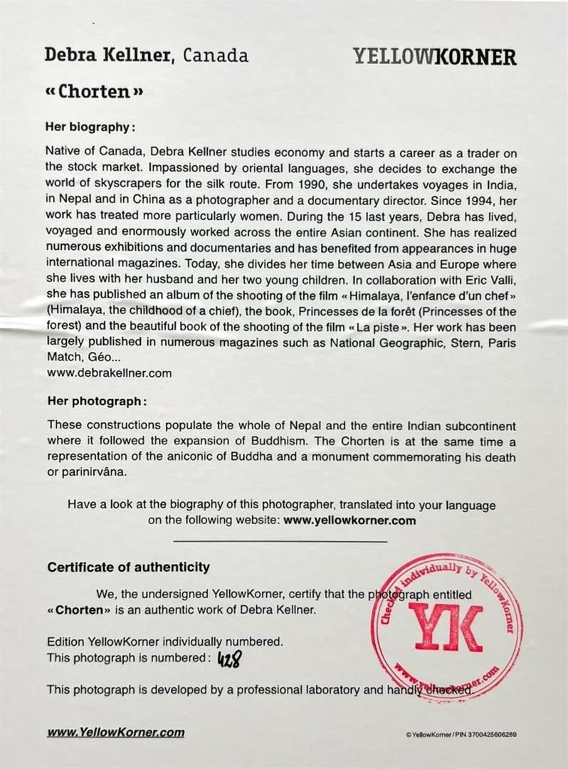 Debra Kellner Canada Chorten YellowKorner Certified Photograph. Certificate of Authenticity from YellowKorner affixed to the back. Matted Dimensions 16"x20". Protected with Clear Mylar Sleeve.
