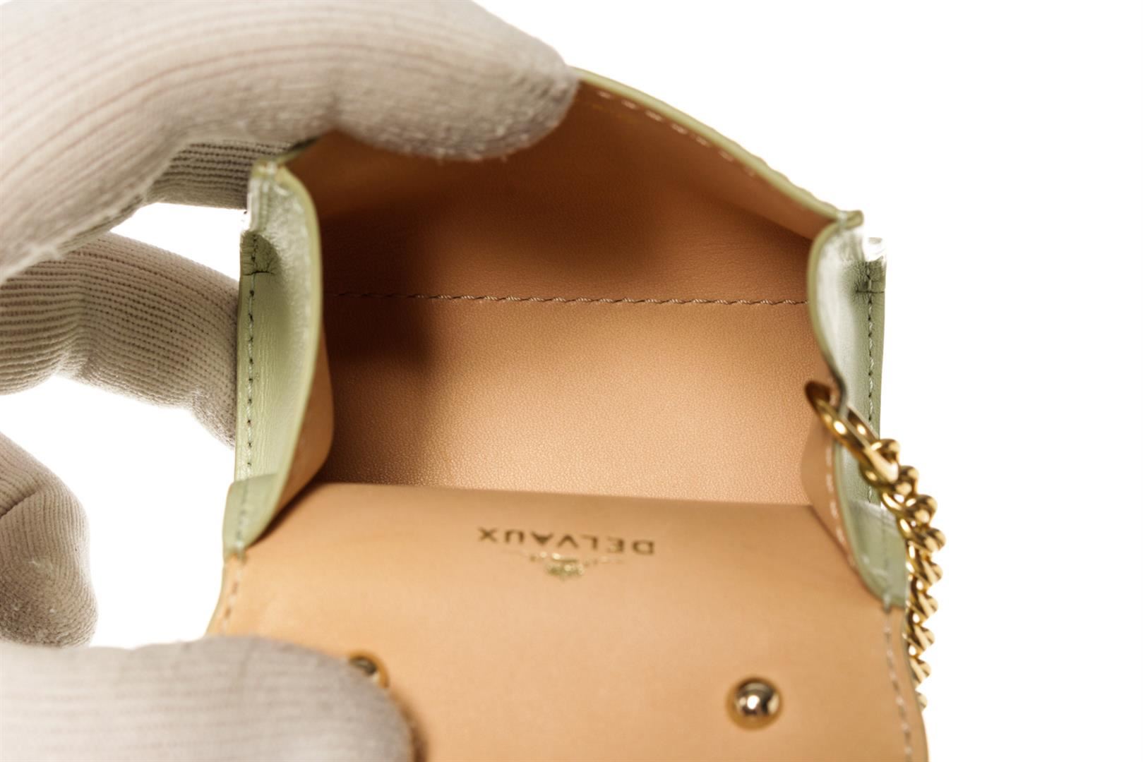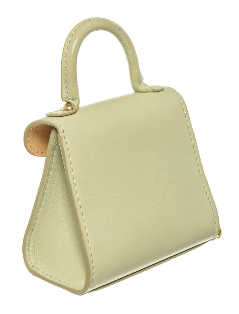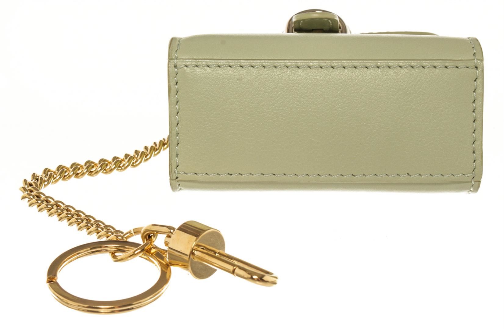 One Delvaux Green Brillant Leather Bag Charm. Item is sold AS-IS. All available information is listed in the description and shown in the photo. This super cute Delvaux bag charm is crafted in Green leather, finished with gold-tone hardware, single top handle, buckle closure that will open to beige leather lining and chain-link detail that will be attached to the keyring. 4.5" W X 1.5"D X 3.25" H