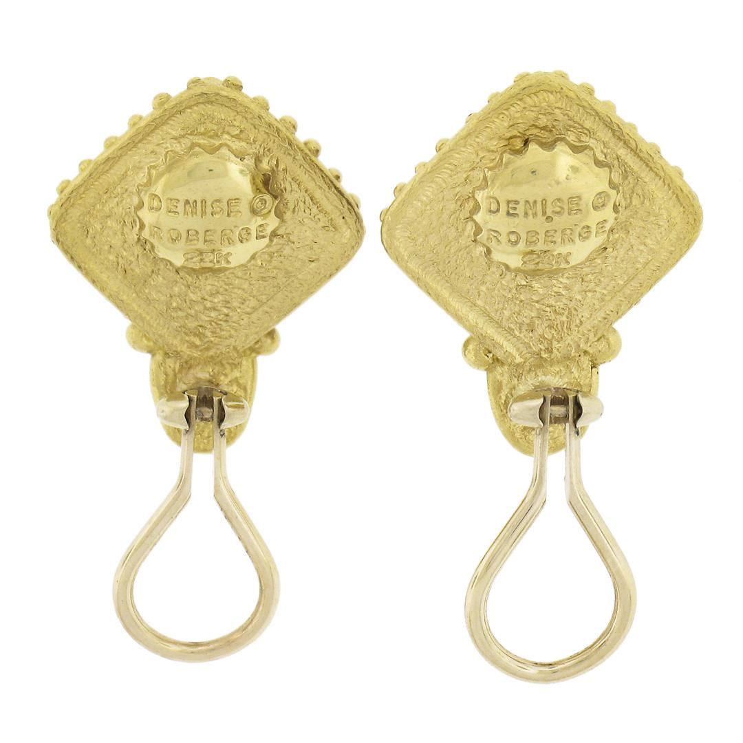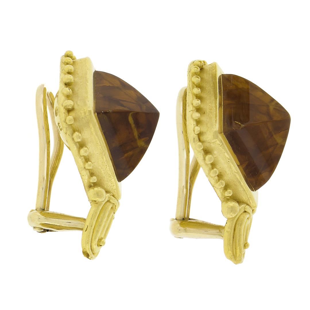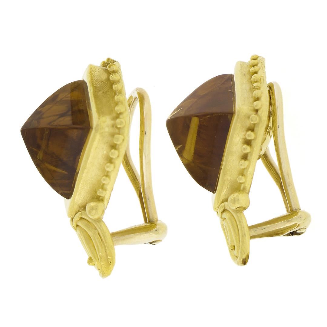 A solid 22k yellow gold clip on earrings bu Denise Roberge, with 2 sugarloaf cabochon cut natrual citrines (13.4x13.4mm each). The earrings measure approximately 23.3x18.3mm and weigh a total of 18.58 grams.
