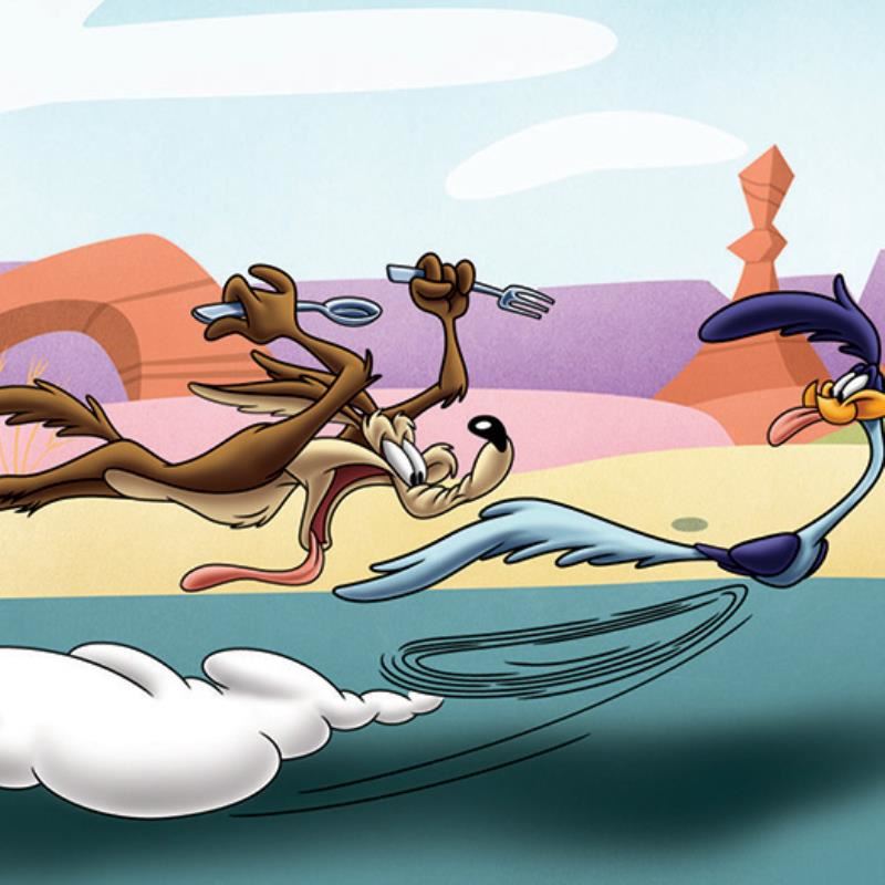 "Desert Chase" is a limited edition giclee on paper from Warner Bros. featuring the Looney Tunes characters Wile E Coyote and Road Runner. It comes numbered, with hologram seal, and a Certificate of Authenticity! Measures approx. 16" x 20" (with border), 12" x 16" (image).