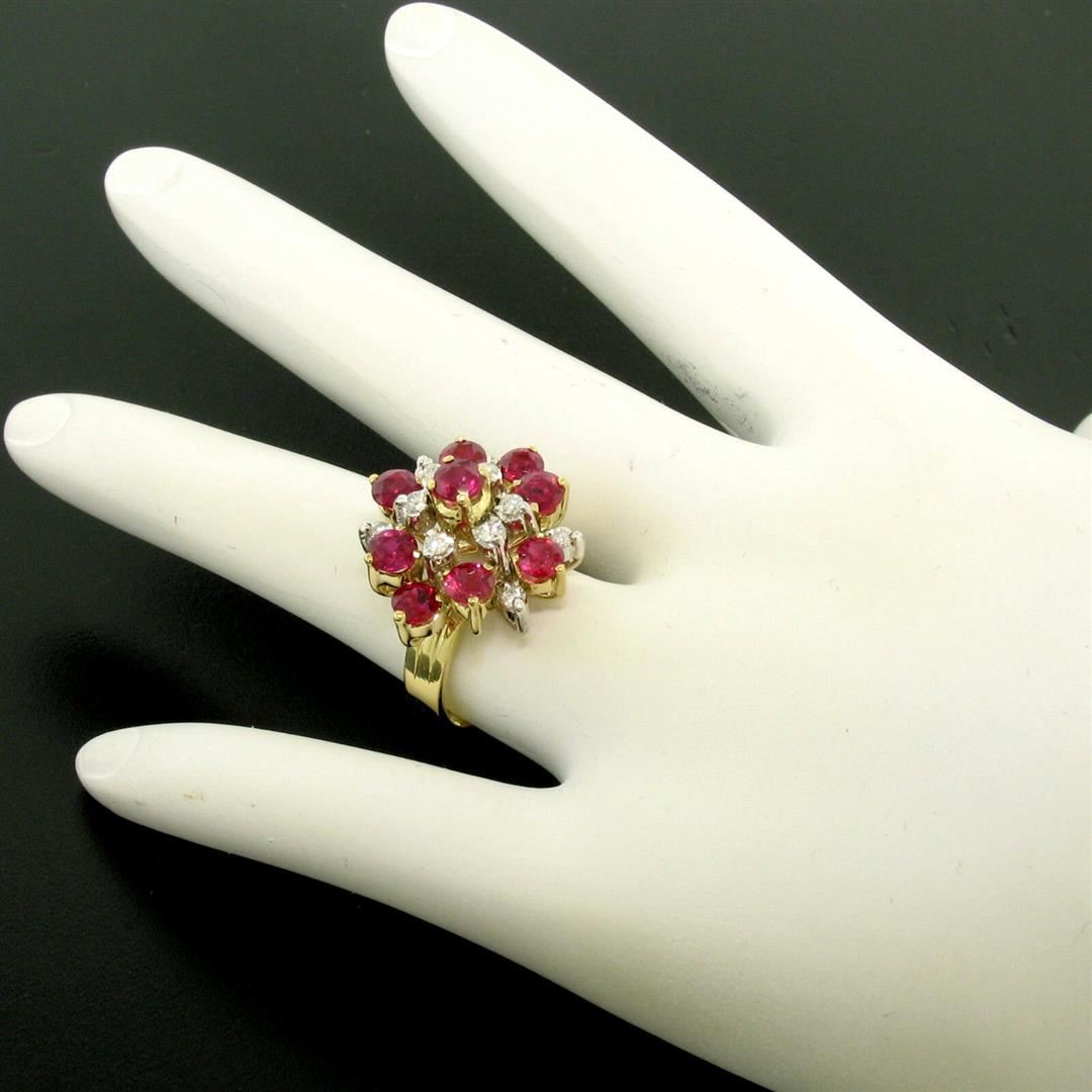 One Designer 14k Two Tone Gold 2.60ctw Vivid Ruby & Brilliant Diamond Cocktail Ring. Item Details: Material: 14k Solid Yellow and White Gold, Weight: 6.9 Grams, Stone(s): (9) Natural Genuine Rubies - Round Brilliant Cut - Prong Set - Pure, Vivid, Blood Red Color - 2.35ctw (approx.), (10) Natural Genuine Diamonds - Round Brilliant Cut - Prong Set - VS1/VS2 Clarity - F/G Color - 0.25ctw (approx.), Total Carat Weight: 2.60 (approx.), Ring Size: 4.25 (We can custom size this ring.), Ring Width: 17.68mm, Ring Height: 11.68mm rise off the finger, Condition: Like New!
