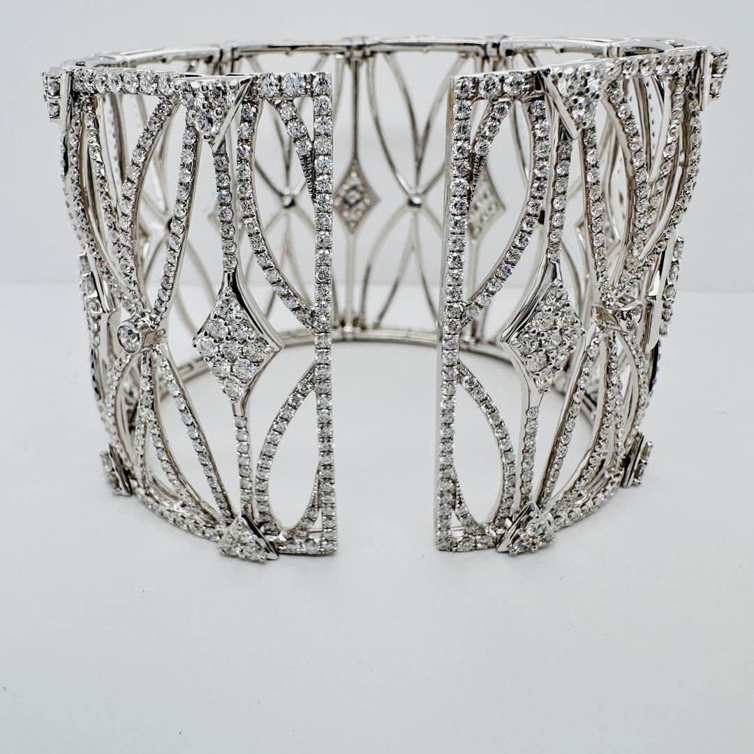 This striking openwork cuff bracelet is crafted from white gold and features an intricate lattice design, extensively set with numerous round brilliant cut diamonds. The multi-tiered, architectural style creates a bold statement piece.