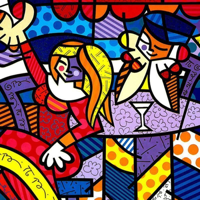 "Doing Lunch Again" is an open edition giclee on canvas by Romero Britto. The piece comes hand signed by the artist and is authenticated en verso with the official Britto stamp. Measures approximately: 14" x 14".