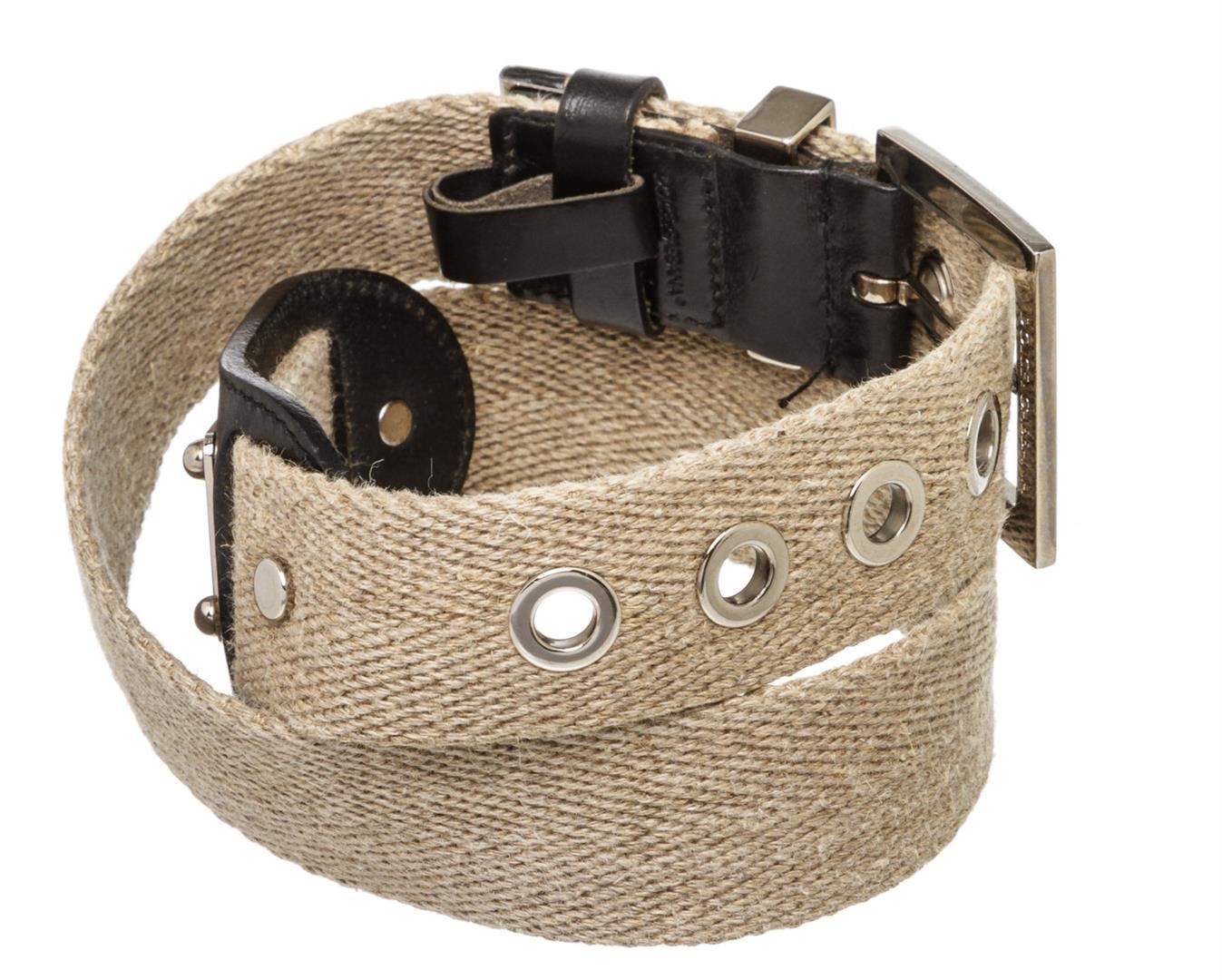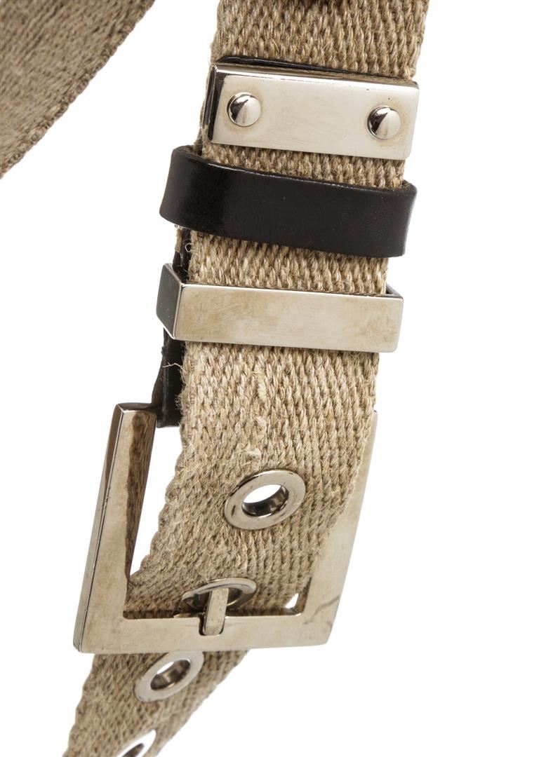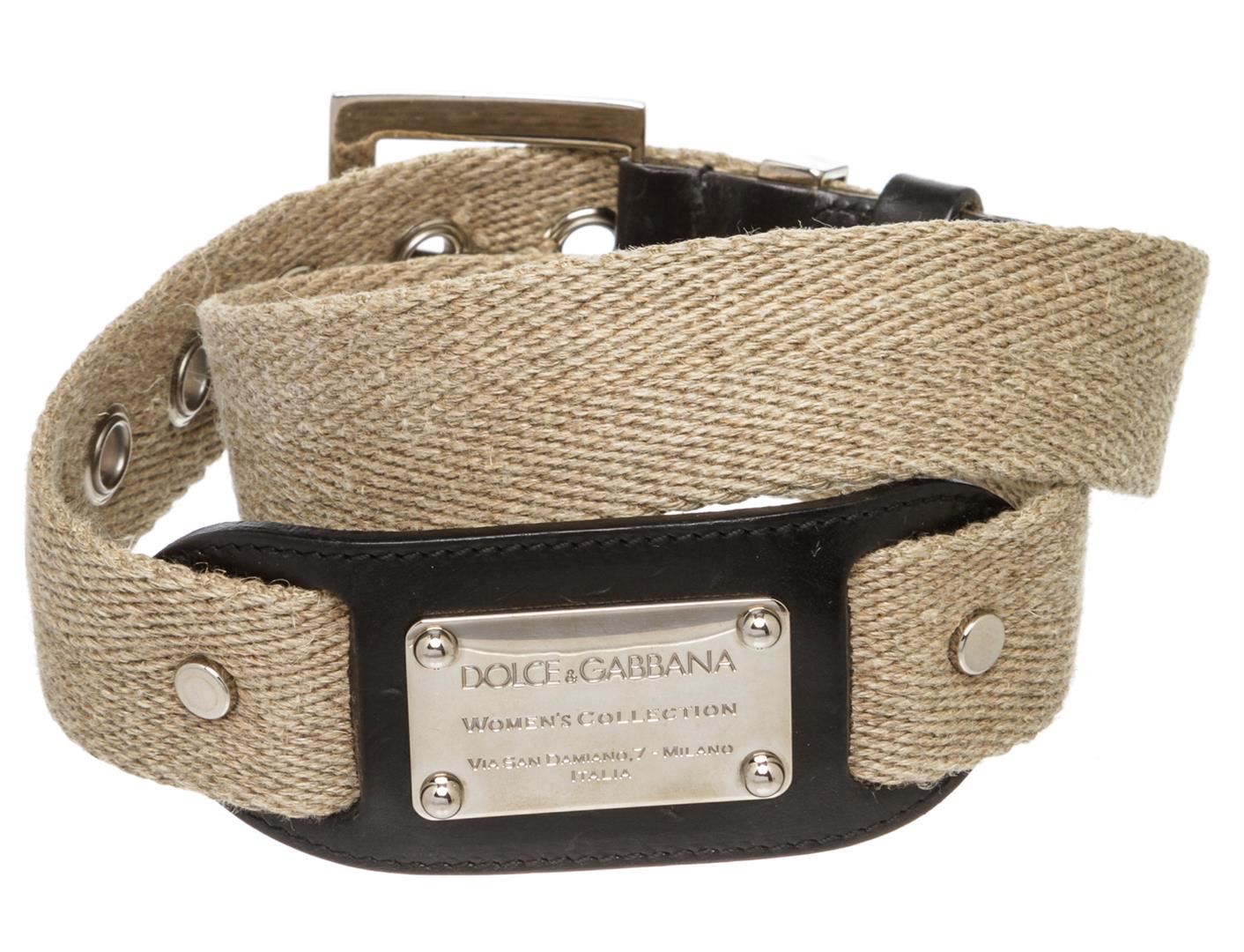One Dolce & Gabbana Tan Canvas and Leather Belt. Tan Dolce & Gabbana belt with a canvas strap featuring a leather trim, silver tone logo plaque detail and buckle closure.