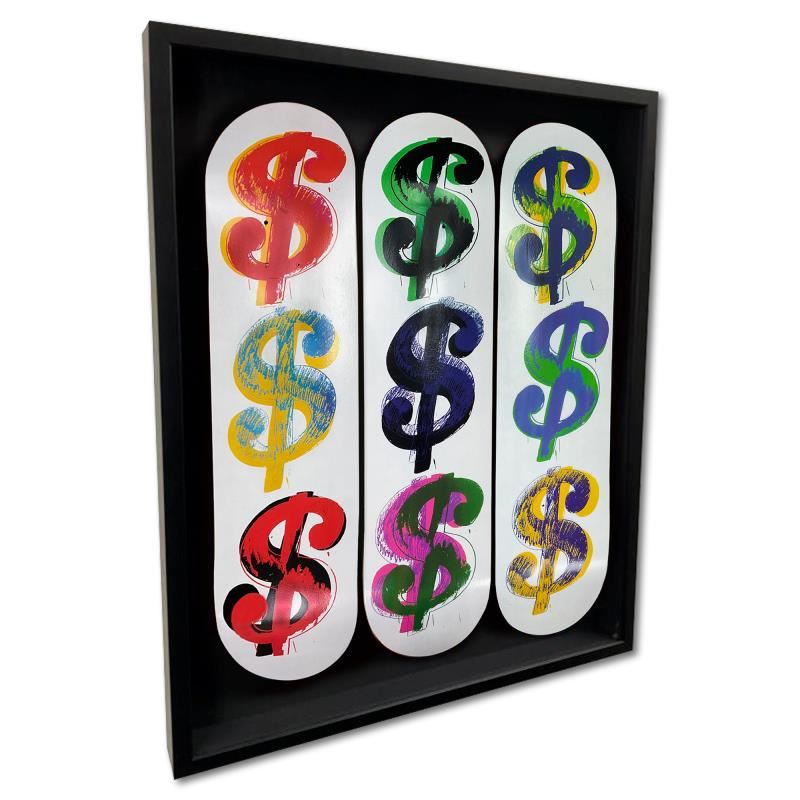 "Dollar Sign (9), 1982" is a skateboard triptych by Warhol (1928-1987), bearing the plate signature of the artist inverso. This triptych comes custom framed. Includes Certificate of Authenticity. Measures approx. 30" x 37" x 3" (frame), 24" x 32" (skateboards).