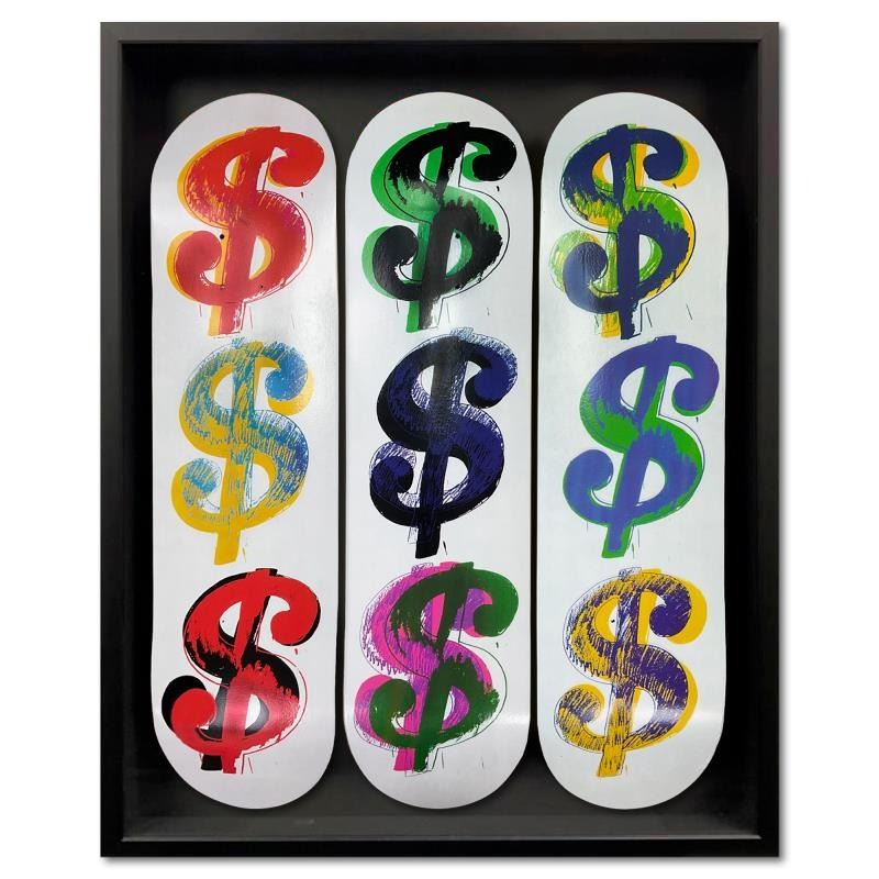 "Dollar Sign (9), 1982" is a skateboard triptych by Warhol (1928-1987), bearing the plate signature of the artist inverso. This triptych comes custom framed. Includes Certificate of Authenticity. Measures approx. 30" x 37" x 3" (frame), 24" x 32" (skateboards).
