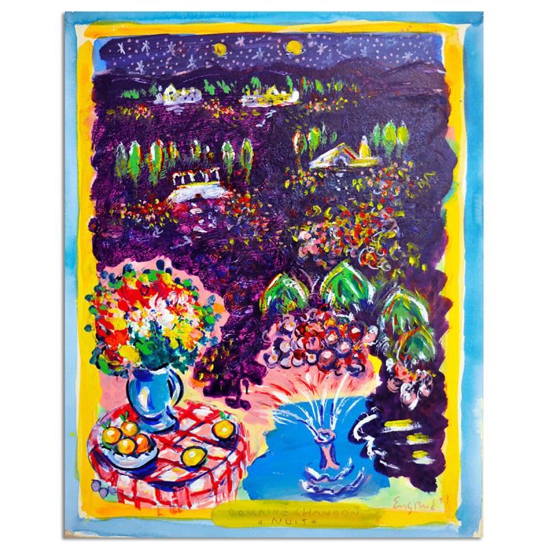 "Domaine Chandon In Napa At Night" is an original Mixed Media on Board by Wayne Ensrud. The piece is hand signed by the artist and comes with a Certificate of Authenticity. Measures approximately 14" x 11".