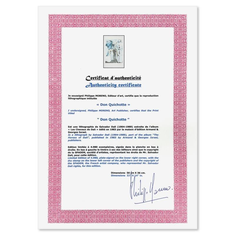 "Don Quichotte" is a limited edition lithograph by Salvador Dali (1904-1989), bearing the plate signature of the artist. This piece was published by Armand & Georges Israel in 1983 during Dali's lifetime and under his supervision. This piece was printed on Velin D'arches paper in Paris. This work is referenced in The Official Catalog of the Graphic Works of Salvador Dali (Albert Fields). This piece comes custom framed. Includes Certificate of Authenticity. Measures approx. 20" x 28" (frame), 14" x 22" (image).