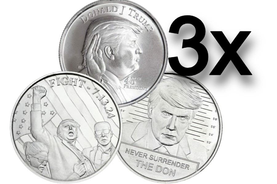 This Donald Trump 1oz .999 Fine Silver Coin Assorted Set features three unique designs honoring the 45th President: the presidential profile, the "Never Surrender" mugshot, and the "Fight" coin commemorating a famous moment of defiance. Each coin is struck in .999 fine silver, making this set a must-have for collectors of political memorabilia and precious metals.