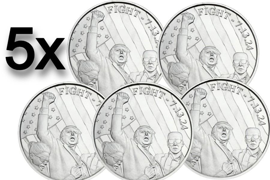 This bundle contains five 1oz .999 fine silver coins featuring the iconic "Fight" image, inspired by the famous assassination attempt on Donald Trump. These collectible coins are ideal for silver enthusiasts and political memorabilia collectors, symbolizing strength and resilience. The bundle makes for a unique and memorable gift or investment.