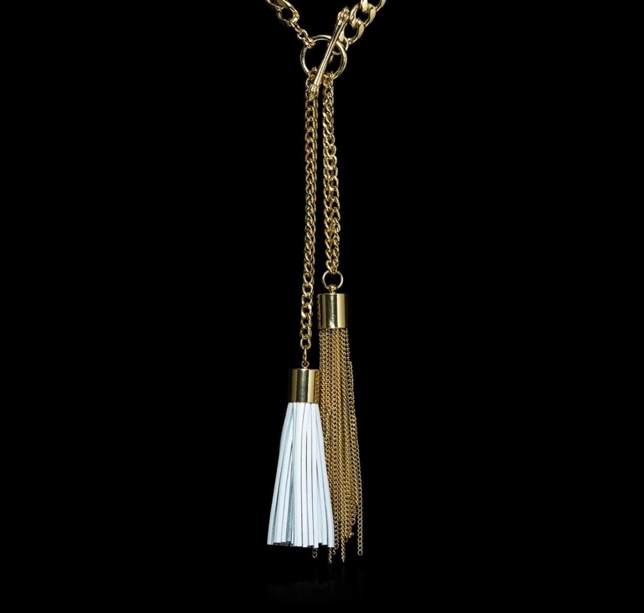 High end designer jewelry. Double Leather Tassel Chain Necklace - Gold Plated. Gold Plated Metal/3" Ext Clasp. White/gold. 28/6.5inches. Total Weight: 120.5 grams.