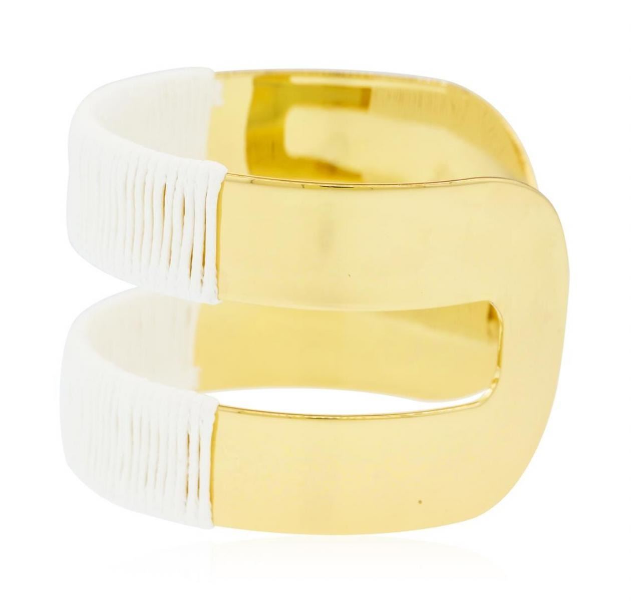 High end designer jewelry. Double Metal Strand Leather Cuff Bracelet - Gold Plated. Gold Plated Metal. White/gold. Adjustable. Total Weight: 47 grams.