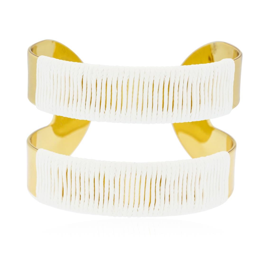 High end designer jewelry. Double Metal Strand Leather Cuff Bracelet - Gold Plated. Gold Plated Metal. White/gold. Adjustable. Total Weight: 47 grams.
