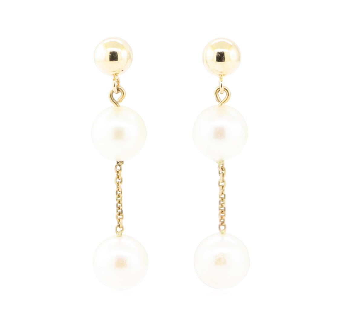 One pair of double dangle pearl earrings, with a drop of approximately 31mm, featuring: 14KT yellow gold weighing 2.6 grams containing four white pearls measuring 7mm in diameter.