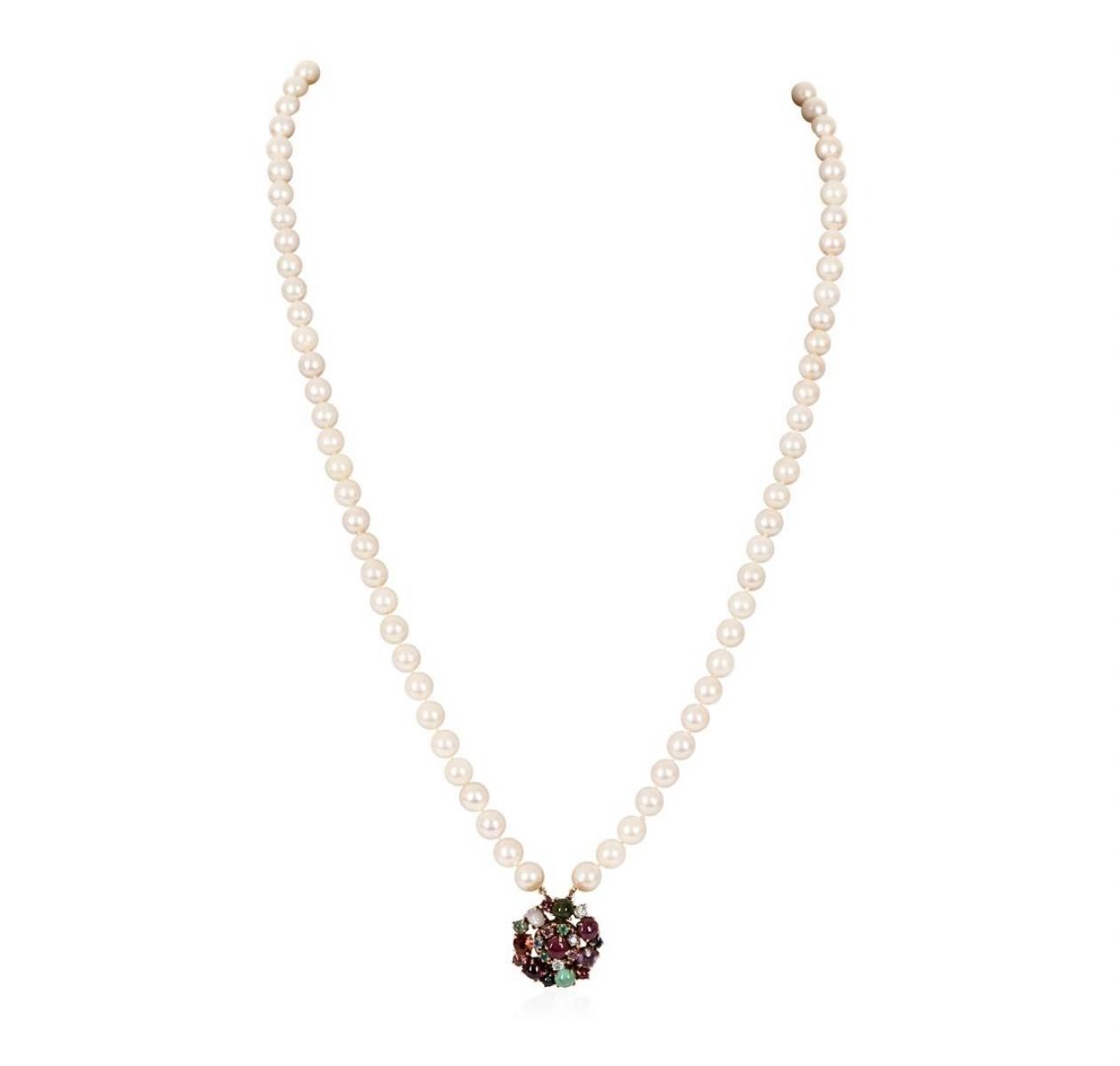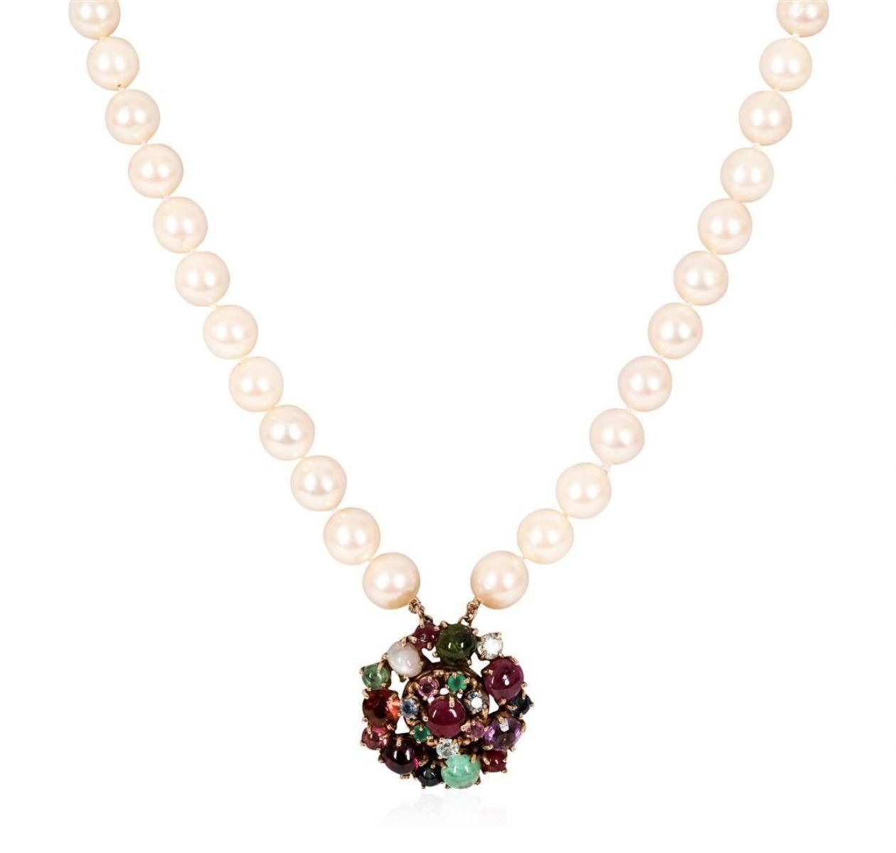 One lady's double strand pearl choker necklace measuring approximately 15.5 inches in length. The pearl range in size from 7.6 to 8.3mm. The necklace has an attached 14KT yellow gold clasp weighing 16.0 grams containing multi-colored natural gemstones.