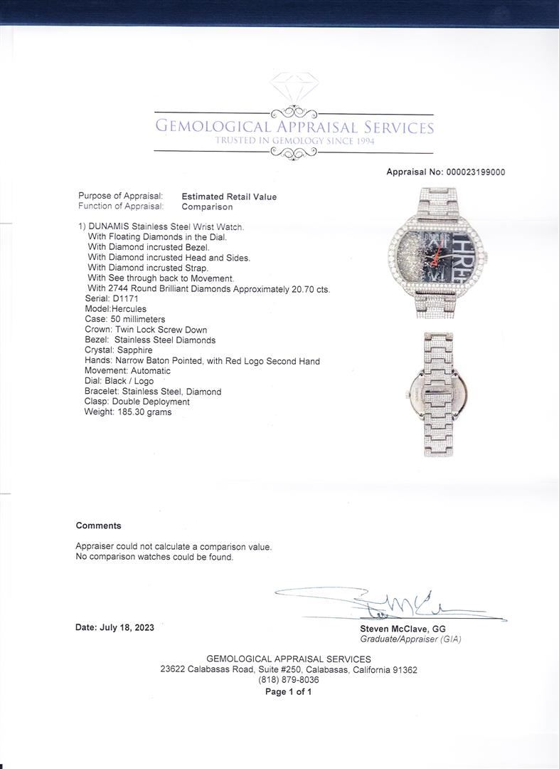 DUNAMIS Stainless Steel Wrist Watch. With Floating Diamonds in the Dial. With Diamond encrusted Bezel. With Diamond encrusted Head and Sides. With Diamond encrusted Strap. With See through back to Movement. With 2744 Round Brilliant Diamonds Approximately 20.70 cts. Serial: D1171 Model: Hercules Case: 50 millimeters Crown: Twin Lock Screw Down Bezel: Stainless Steel Diamonds Crystal: Sapphire Hands: Narrow Baton Pointed, with Red Logo Second Hand Movement: Automatic Dial: Black/Logo Bracelet: Stainless Steel, Diamond Clasp: Double Deployment Weight: 185.30 grams... We've been told that similar items without diamonds on the band, have been found online for up to $38K!