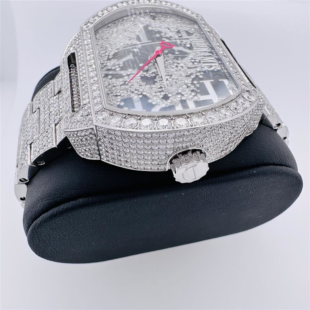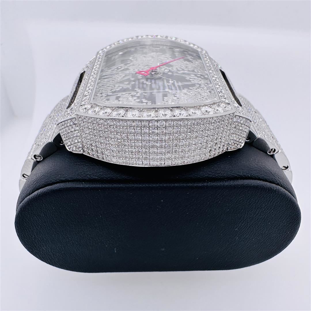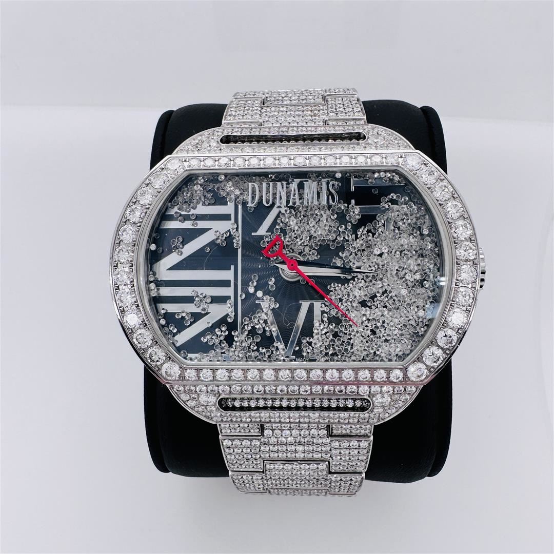 DUNAMIS Stainless Steel Wrist Watch. With Floating Diamonds in the Dial. With Diamond encrusted Bezel. With Diamond encrusted Head and Sides. With Diamond encrusted Strap. With See through back to Movement. With 2744 Round Brilliant Diamonds Approximately 20.70 cts. Serial: D1171 Model: Hercules Case: 50 millimeters Crown: Twin Lock Screw Down Bezel: Stainless Steel Diamonds Crystal: Sapphire Hands: Narrow Baton Pointed, with Red Logo Second Hand Movement: Automatic Dial: Black/Logo Bracelet: Stainless Steel, Diamond Clasp: Double Deployment Weight: 185.30 grams... We've been told that similar items without diamonds on the band, have been found online for up to $38K!