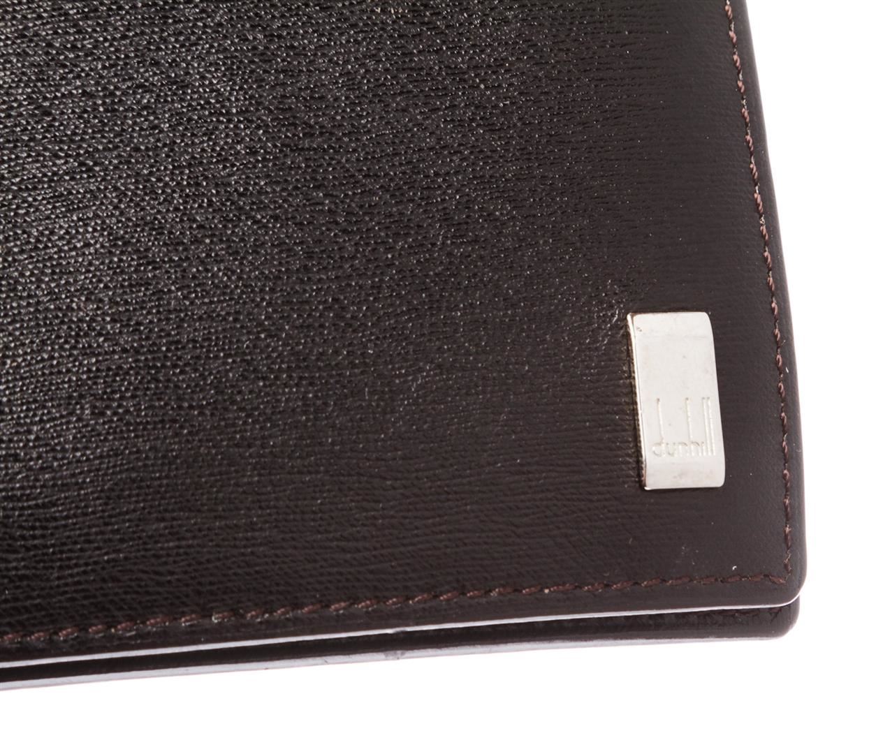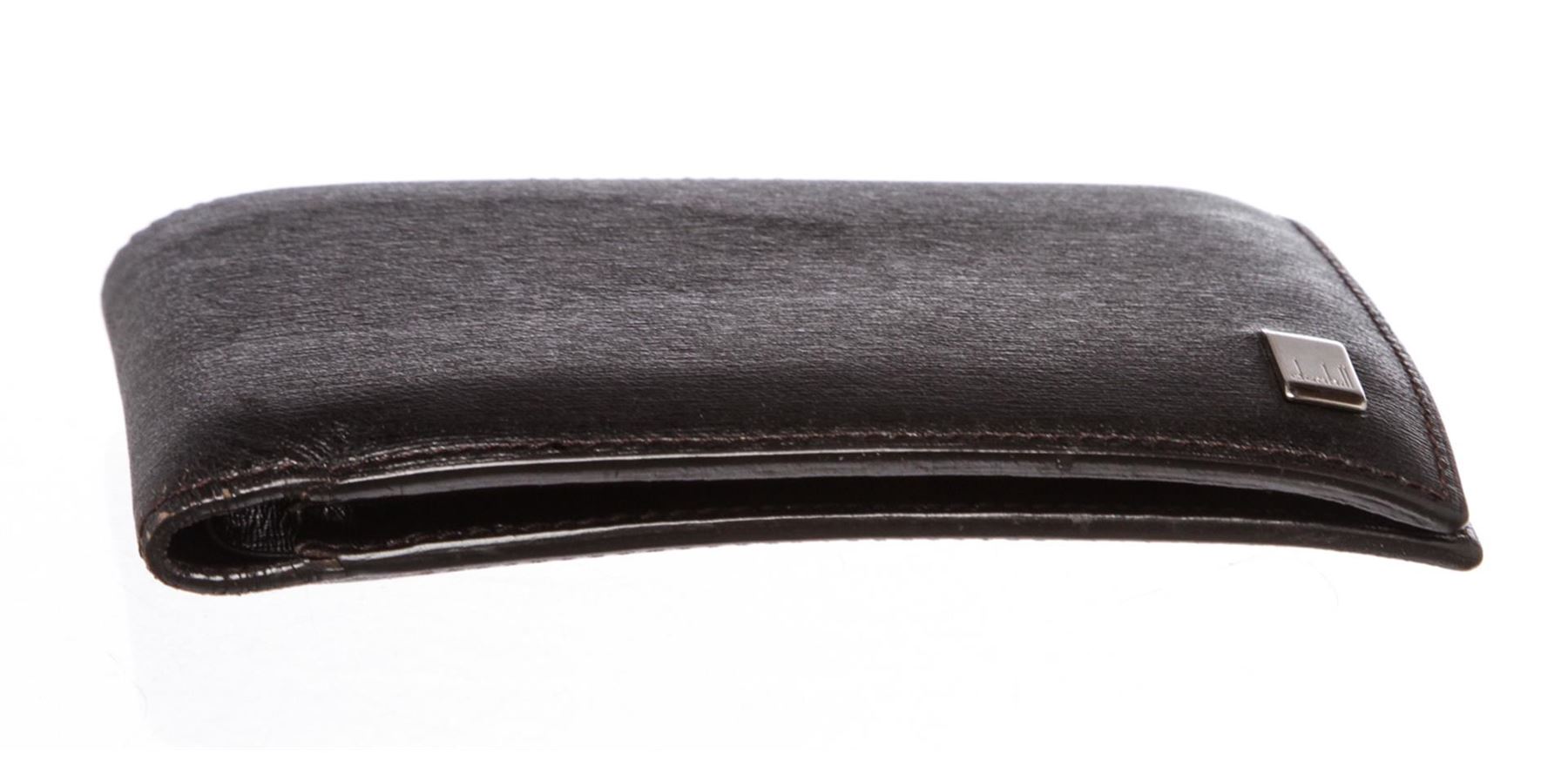 Dunhill black leather bi fold wallet. Inner four card slot, money slip pocket, snap closure change pocket and leather lining.