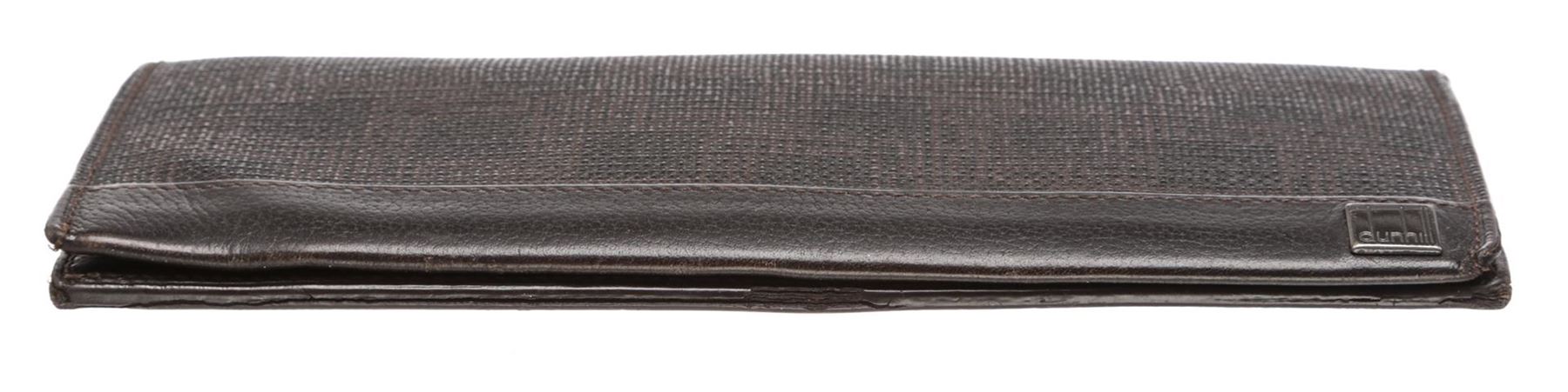 Dark brown Dunhill canvas and leather bifold long wallet with tonal leather lining, ten credit card pockets, two open pockets, one zipper pocket and one side slip pocket.