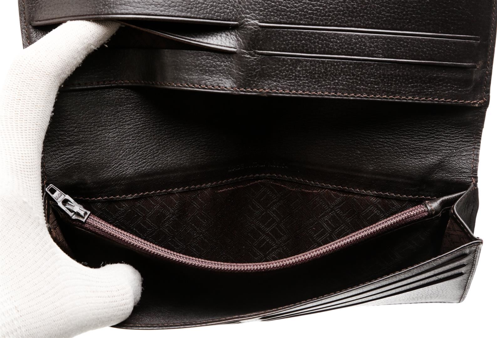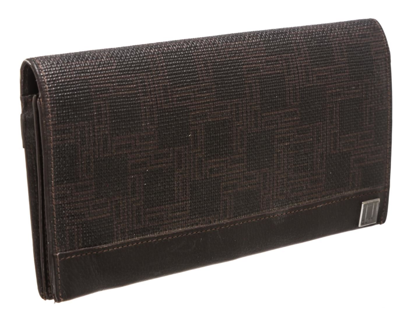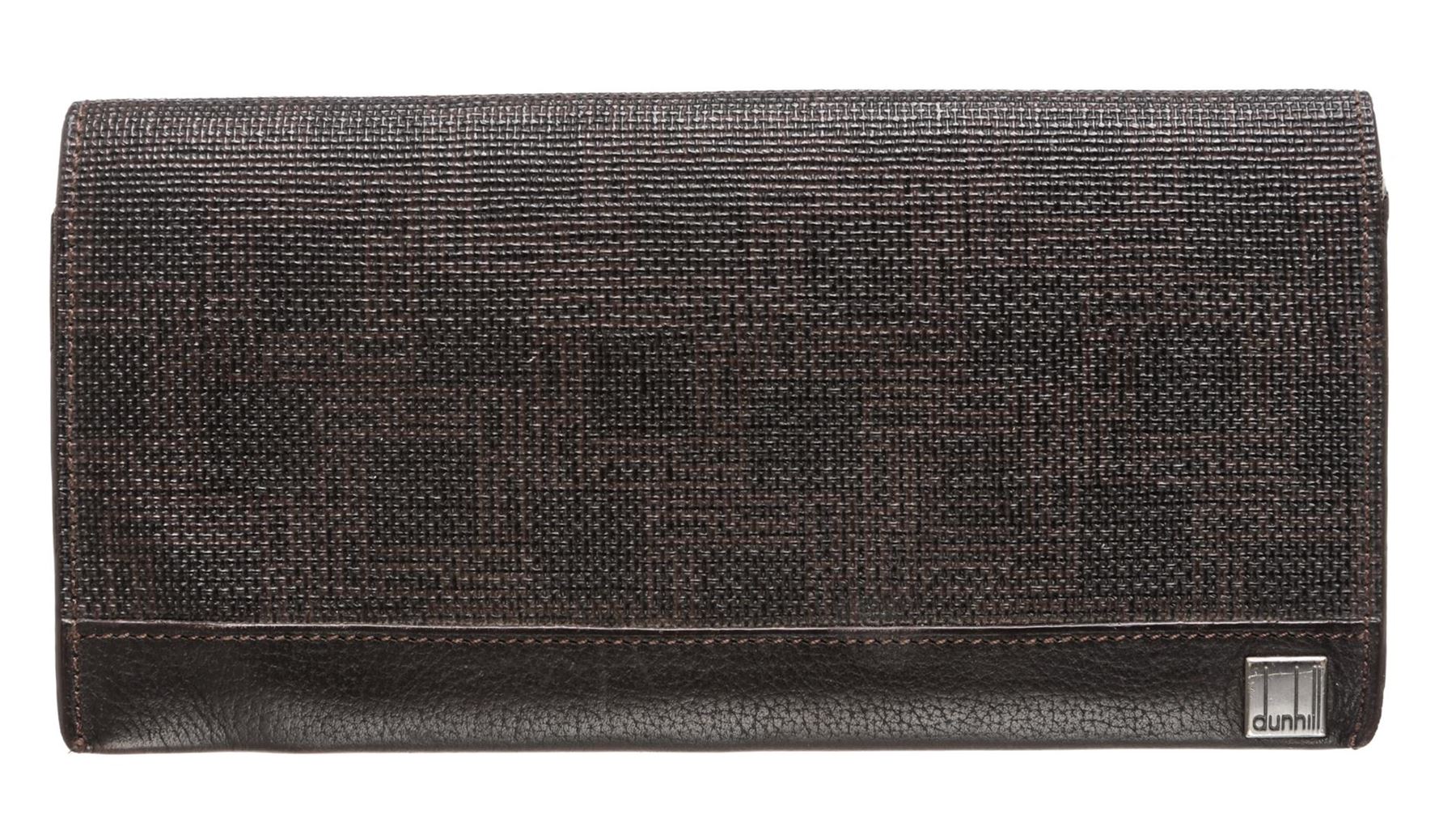 Dark brown Dunhill canvas and leather bifold long wallet with tonal leather lining, ten credit card pockets, two open pockets, one zipper pocket and one side slip pocket.